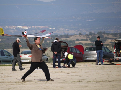 Hoy al frente de la prueba estaba el Club Alcaudón con Jesús Dávila a la cabeza y el bueno de Arístides –alma mater de ese Club y de esta Liga de F5J K4/K6- en el recuerdo, actualizado hoy por la presencia de Mónica, una de sus hijas, en el campo de vuelo. Tuvo algo de trabajo porque el viento ha estado hoy más caprichoso que en otras ocasiones y ha habido que mover los puntos de aterrizaje en un par de ocasiones a lo largo de la mañana.