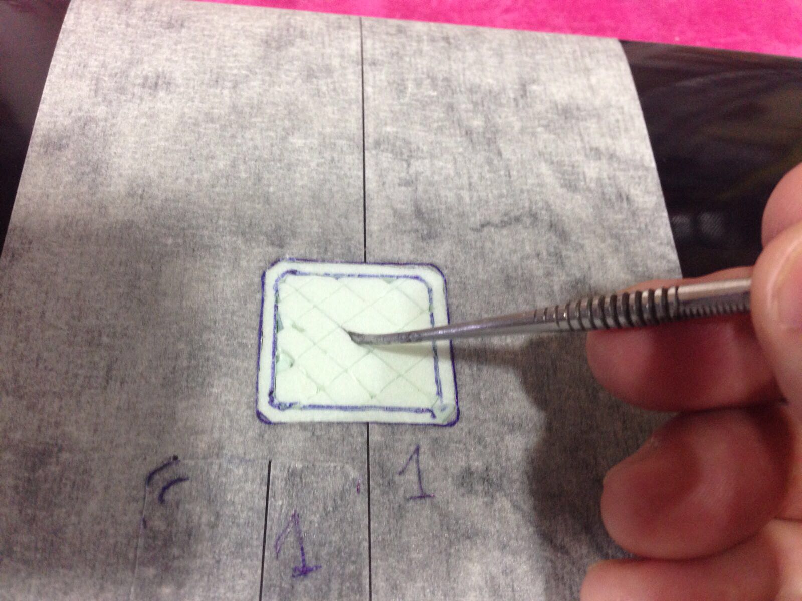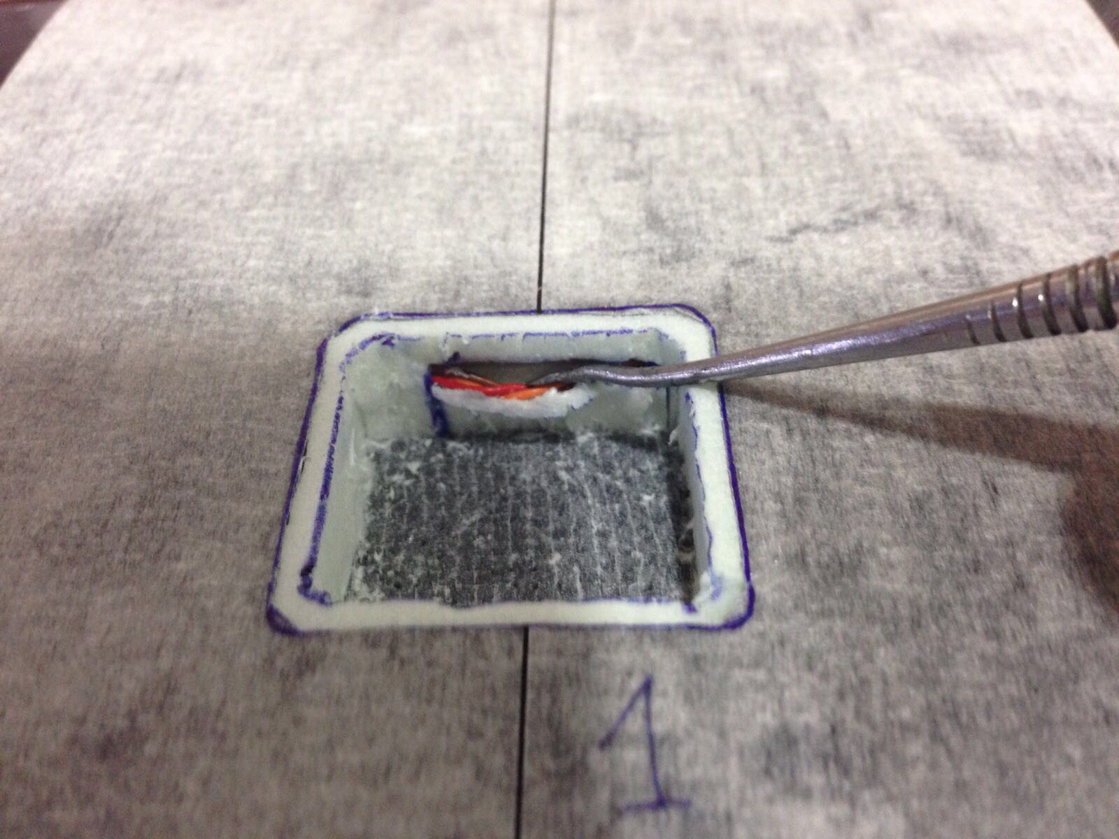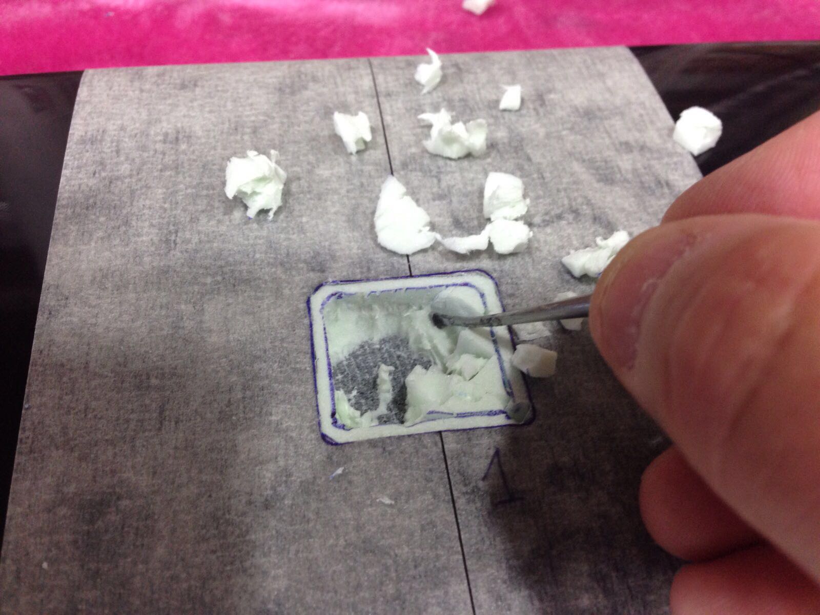 Una vez marcados los agujeros donde depositaremos los servos realizo varios cortes con el ‘cuter’ y después lo vacío con una ‘puntilla’…