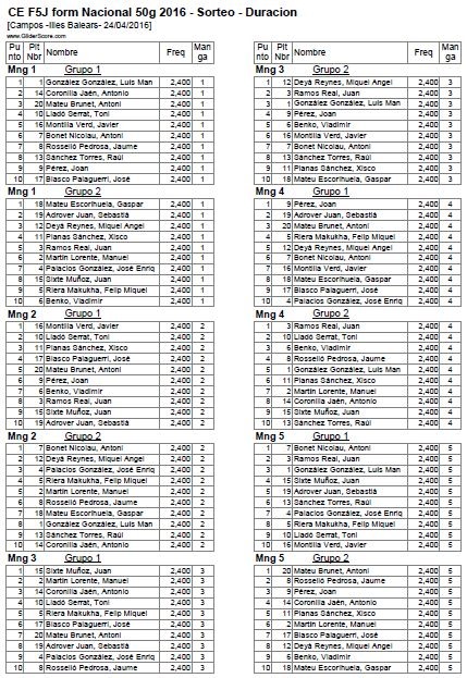 Ya tenemos la composición de los grupos de vuelo en el Campeonato de España que D.m. organiza el Club Aeromodelismo Campos el próximo domingo 24 de Abril en Campos (Mallorca)…