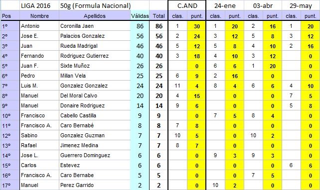 La Liga Andaluza de F5J-50g, una vez contabilizada esta prueba queda: