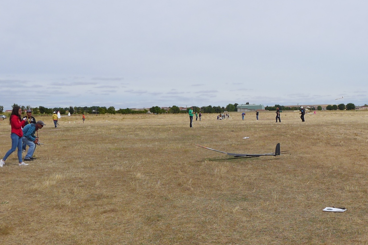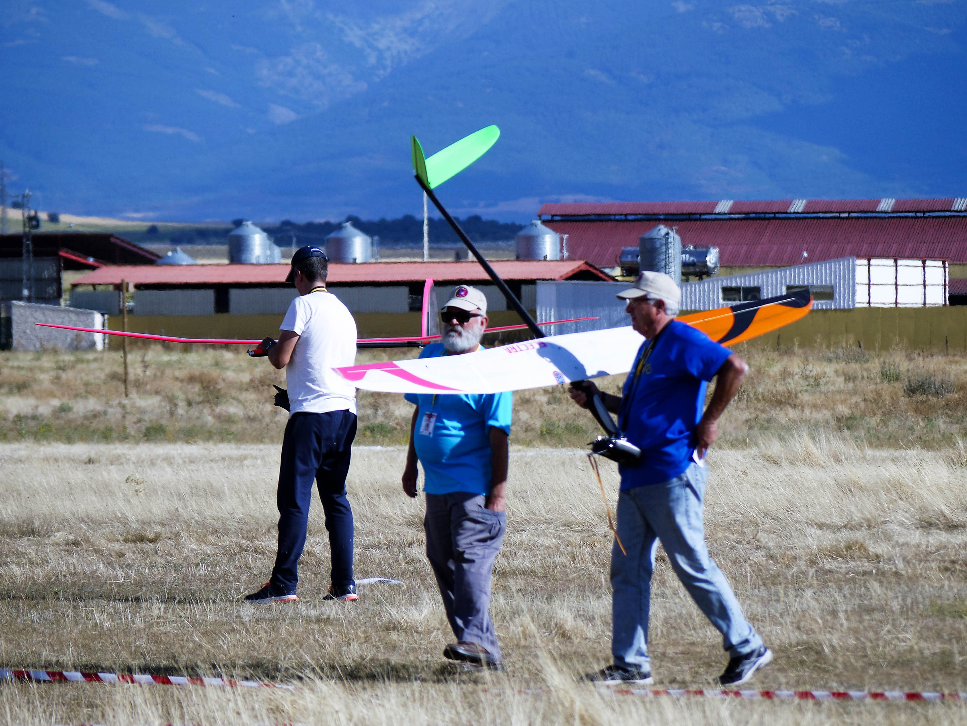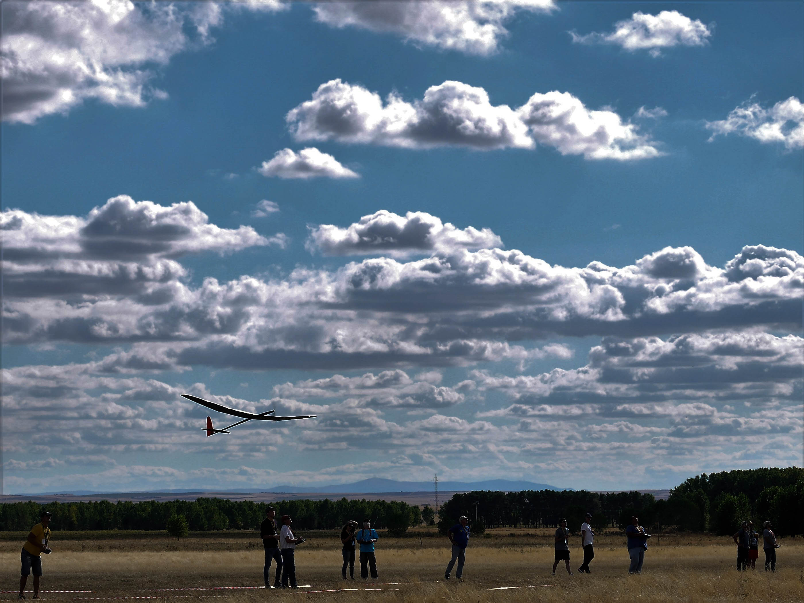 Con la megafonía en marcha (gentileza del Ayuntamiento de Escalona del Prado), las 16:00 horas comienzan los vuelos divididos en dos grupos. Con orientación norte, despegamos y buscamos la ansiada ascendencia, pero resulta muy esquiva, algunos encuentran y resisten en zonas con ligera actividad, que solo se puede aprovechar con un fino pilotaje. Pero, como tantas veces, ¡ay del que no encuentra nada¡, al suelo sin remisión y sin poder hacer más que una fracción de los 10 minutos pretendidos.