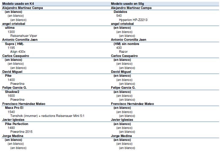 Los modelos facilitados por los pilotos es la que se ‘lista’ a continuación y donde podemos ver el modelo, su peso y el motor que usa; la primera lista las de los modelos usados en K4 y 50g