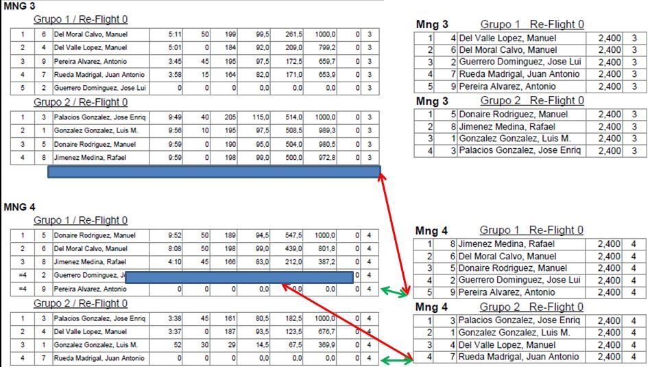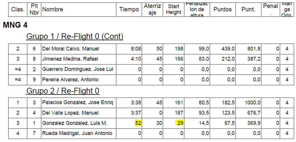 Las casualidades hicieron que nos diéramos cuenta al comienzo del vuelo del Grupo 2 de la MNG 4 porque Juan creía que volaba de nuevo en el punto 3 del que era el grupo 1 de la MNG 5 que estaba ocupado, correctamente, por Manuel del Valle; y todo a falta de treinta segundos para el comienzo del vuelo … luego todo quedaría aclarado y… penalizado, tanto a Antonio como a Juan se le puntuó cero los correspondientes vuelos ‘erróneos’ como puede verse en la imagen anterior.