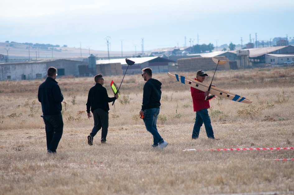 La meteorología estaba muy cambiante y eso hizo que en muchos momentos los aviones todos estuvieran arriba y lograran conseguir los tiempos, pero hubo un par de descensos que fueron los que al final marcaron las diferencias. En concreto os hablare de uno de esos descensos que viví en carne propia, estaba volando desde el punto más alejado del pueblo, habíamos subido a una altura muy respetable, los que volaban a mi lado se quedaron prácticamente en la vertical del campo y yo aproximadamente igual que ellos pero rumbo al pueblo, de pronto vivimos el descenso y al oír a mis compañeros quejarse de lo que estaba sucediendo y teniendo altura suficiente y algo más de distancia pude irme más hacia el pueblo y allí guardar mi altura e incluso subir algo más. Entre risas por lo bien que me había salido de esa situación oía a Rafa, Fernandito y Juan Sixte comentar lo que había sucedido, me había escapado pero me fui tan lejos de mi punto de vuelo que la emisora se queda sin alcance y tuve que salir corriendo unos metros para poder de nuevo radio con el velero porque ya estaba totalmente fuera de control.