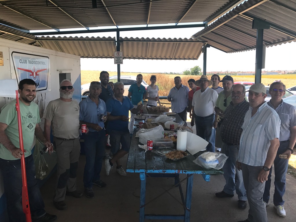 Al final del tercer vuelo, en el ecuador de la prueba, dimos buena cuenta de las viandas que Fran nos había preparado y a la sombra de la encina pudimos reponernos y cargar pilas antes de salir de nuevo bajo la canícula inclemente que presidió las tres últimas mangas del concurso, que a pesar de la caló fueron muy entretenidas y disputadas, dado lo imprevisible del comportamiento atmosférico, ya que el supuesto sitio bueno para volar de la manga anterior se convertía en socavón descendente para los de la siguiente. Sin mencionar los traicioneros efectos de las contraladeras de borde de campo, que hace que algunos aterrizajes se conviertan en película de terror y que obligó a más de uno a dar motor (sensatamente) para evitar la posible rotura del modelo, que es lo que explica los 0.0 que aparecen salteados en la clasificación general.
