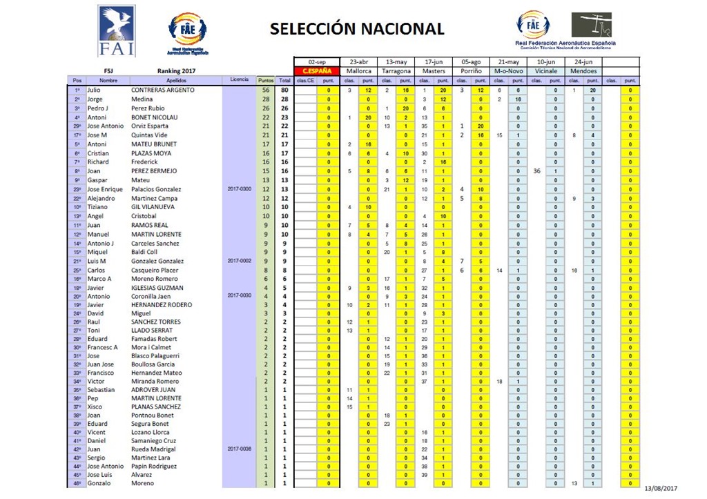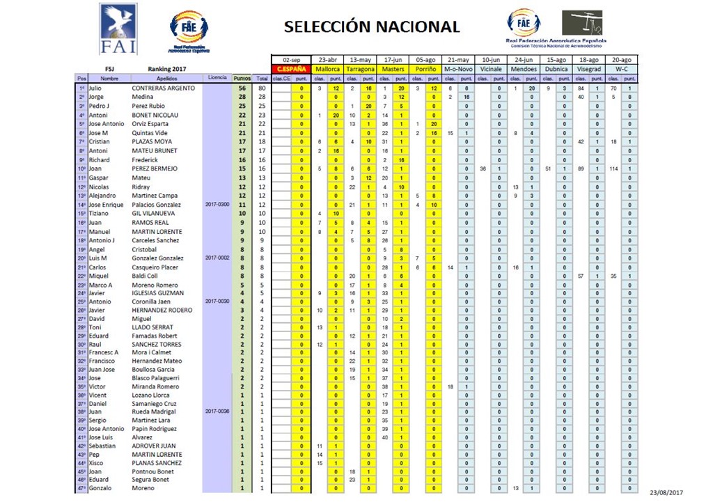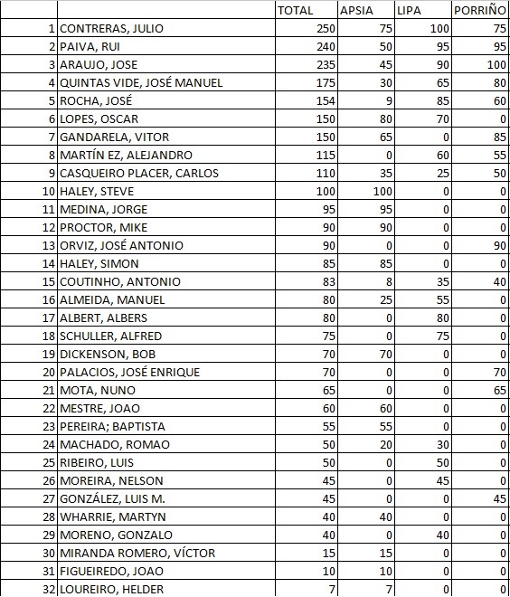 Una vez publicados los resultados oficiales de las pruebas celebradas en Slovakia la semana pasada y salvo error u omisión (que rogaría se comentara), a la fecha el ranking está como sigue: