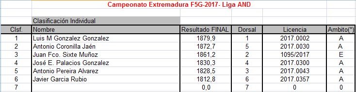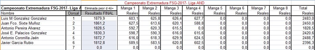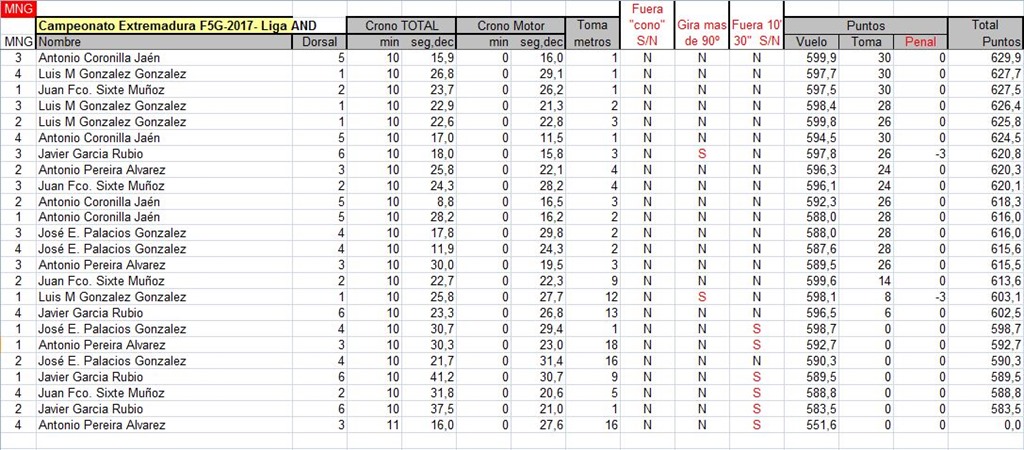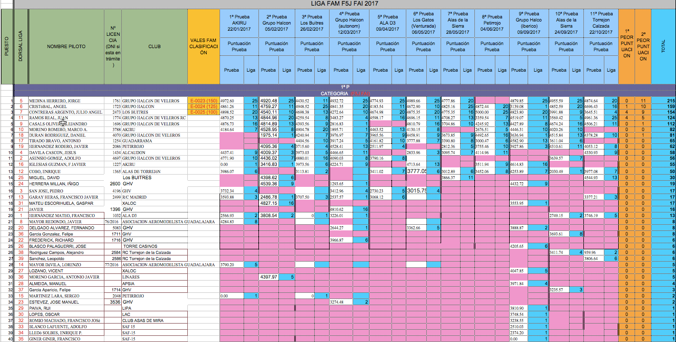 Os adjunto fichero excel con la clasificación actual de la Liga FAM F5J OPEN K4/K6. Eliminado el peor concurso a falta de que, una vez finalizada la liga, se eliminen las dos peores puntuaciones.