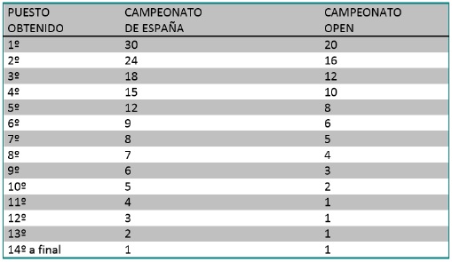 La puntuación asignada a cada prueba sigue la siguiente tabla: