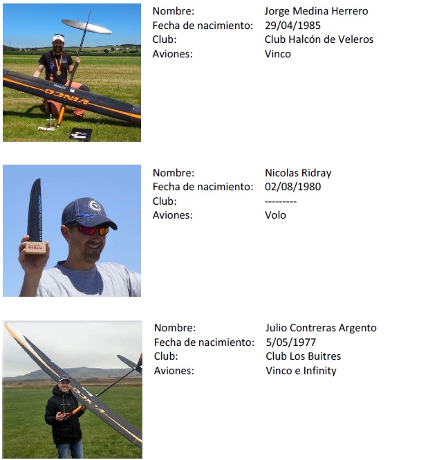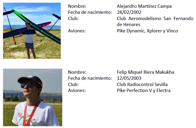 Los pilotos seleccionados para el presente 2019 y que nos representarán en el primer Mundial de F5J a celebrar en Trnava (Eslovaquia) en agosto son: