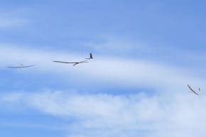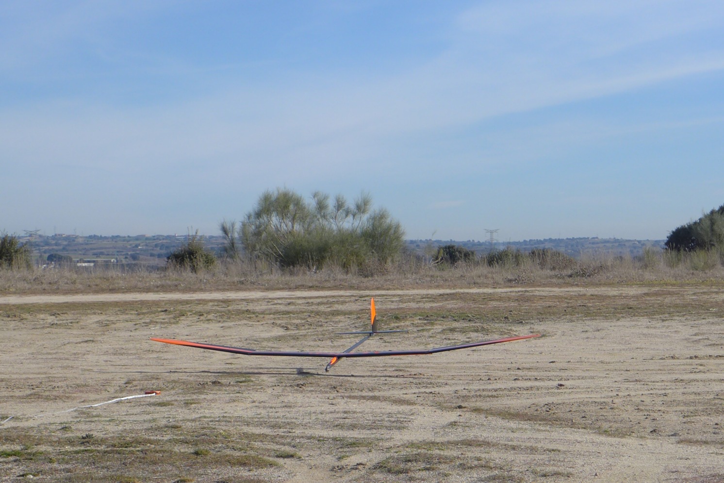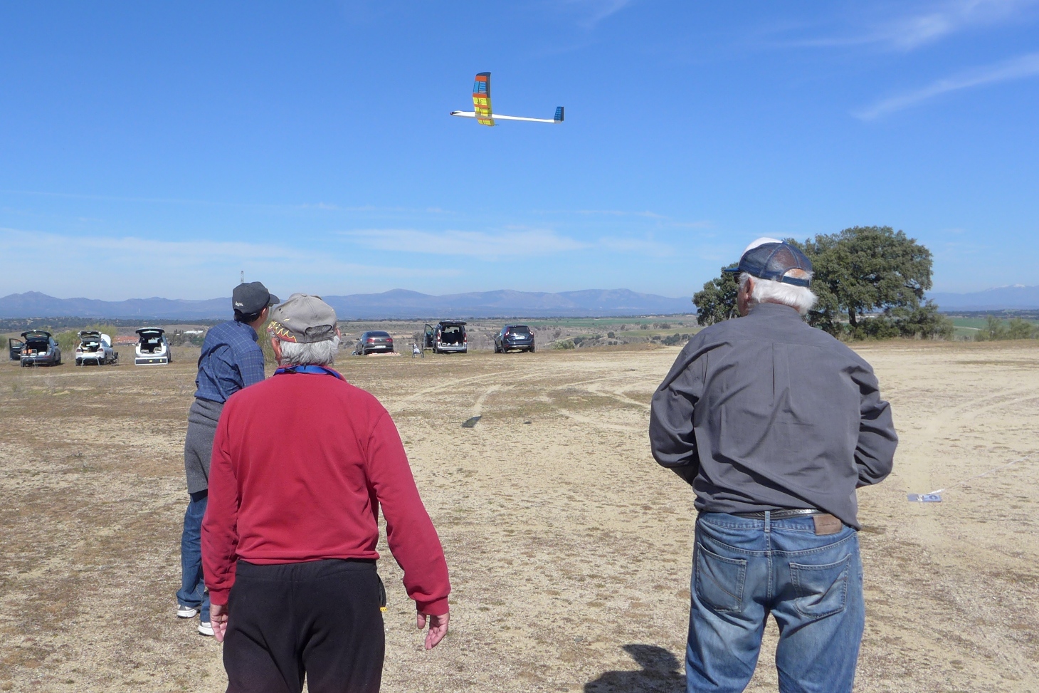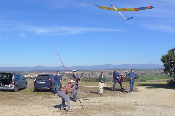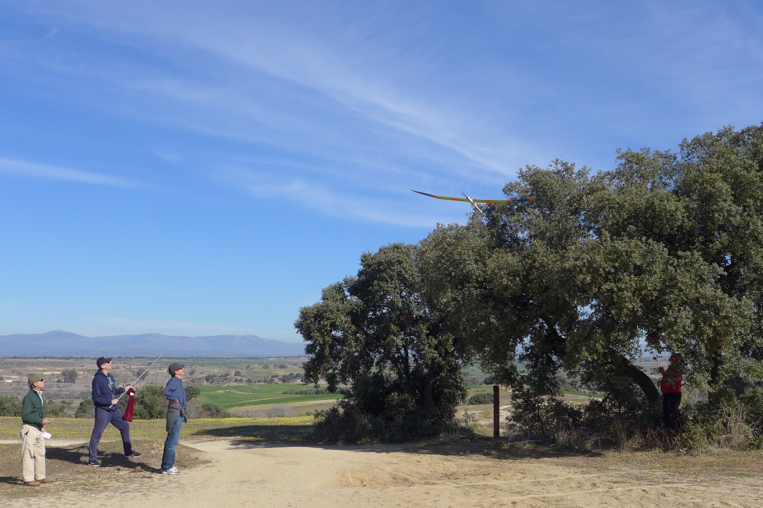 Como iba diciendo, tras el bocata vino el cambio radical de condiciones de vuelo. Por fin, los chicos de la AEMET se hacían notar y Eolo se desataba. A muchos se nos ponía una sonrisa en la cara en las salidas, entre el uso de la segunda batería a plena carga y el ventarrón las subidas –ahora sí- eran casi estratosféricas. Sonrisa que se borraba cuando comprobabas las dificultades para moverse y buscar y carita de pánico al ver crecer y crecer a toda velocidad la silueta de tu velero, de manera que al poco de cantarte los tres minutos de vuelo estabas ya buscando con la vista el punto de aterrizaje porque poco más se podía hacer ya para seguir arriba.