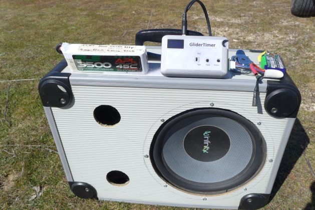Jesús Dávila llevaba hoy la batuta del encuentro con la ayuda de Juan Ramos y Javier Hernández para los protocolos técnicos propios de la modalidad: mediciones de pesos y potencia de motor. También hay que reseñar entre los aspectos técnicos el estreno en competición del ‘GliderTimer’, lo que en otras latitudes se llama “La Secretaria” o “La Megafonía”. Un altavoz potente que emite las locuciones de cada manga para los concursantes, alimentado por una batería de LiPo 3S, como no podría ser de otra manera entre aeromodelistas, provisto de un mando a distancia que permite acelerar las grabaciones o parar o volver a encender según las necesidades del director de la prueba. Detalle este que nos ha permitido poder volar las 6 mangas sin problemas de tiempo ya que si se veía que la gente estaba ya en su punto de vuelo con sus cronometradores se procedía a acortar los tiempos de espera. Un aparatejo que promete.
