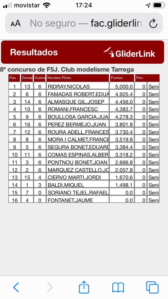 15º Rafael Soriano, cero puntos. Al salir al primer vuelo no se percató él, ni nadie (sí en un video por los foros, gracias compis del f5jgourmet) que llevaba los Flaps desplegados, así que viento fuerte de frente, Flaps abajo, motor a tope y velero al carajo…..subidón vertical con looping y a la parte trasera del campo que era un remolino aspirador, aun así logro salvarlo pero una pequeña rotura le impidió seguir el concurso.