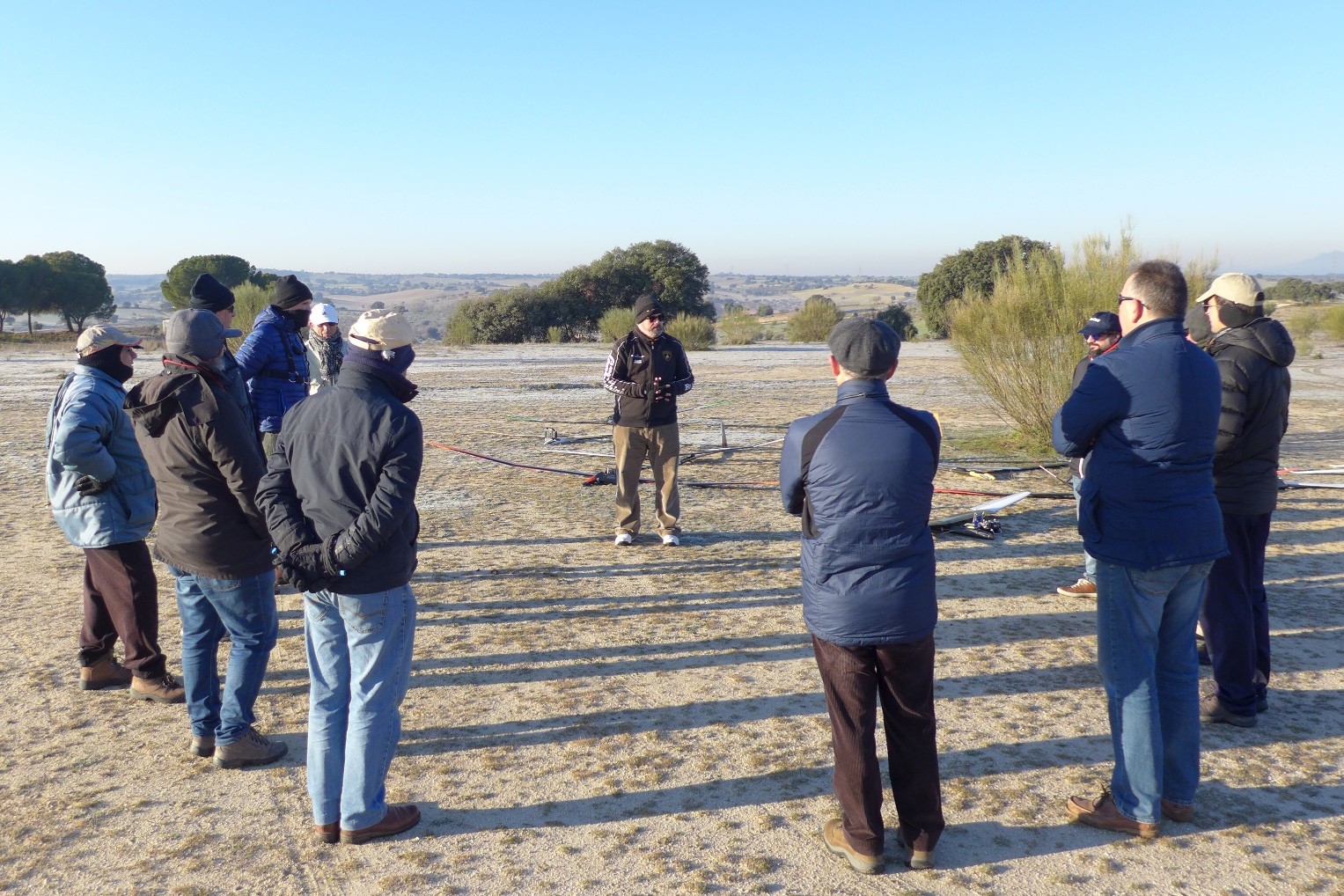 Entre siete y cinco bajo cero marcaban los termómetros de los coches cuando esta mañana salíamos del confortable habitáculo del automóvil a un campo completamente blanco de escarcha. Yo porque tenía la obligación de ir ya que era el director de la prueba al ser mi Club el organizador del primer concurso del año de la Liga Madrileña, pero anda que los chalaos que se habían pegado el madrugón y andaban tiritando de frío mientras intentaban que los tornillitos del montaje de los veleros no se les cayeran al suelo por culpa de unos dedos entumecidos por el frío que ya no sabían si eran suyos o no porque no los sentían.