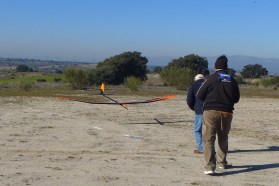 Sexto ha sido David Miguel, posiblemente la resaca de los polvorones la ha acusado más que otros veleristas, desde luego lo que ha sido espectacular es la pirueta con la que nos ha deleitado en uno de los aterrizajes enganchando la cuerda de la cinta métrica del vecino y levantándola por los aires, el problema ha sido la mala respuesta de la cinta que al terminar en una carcasa de plástico ha golpeado violentamente el borde de ataque del Pike, menos mal que ha podido hacerle una reparación de urgencia sobre la marcha para poder seguir volando.