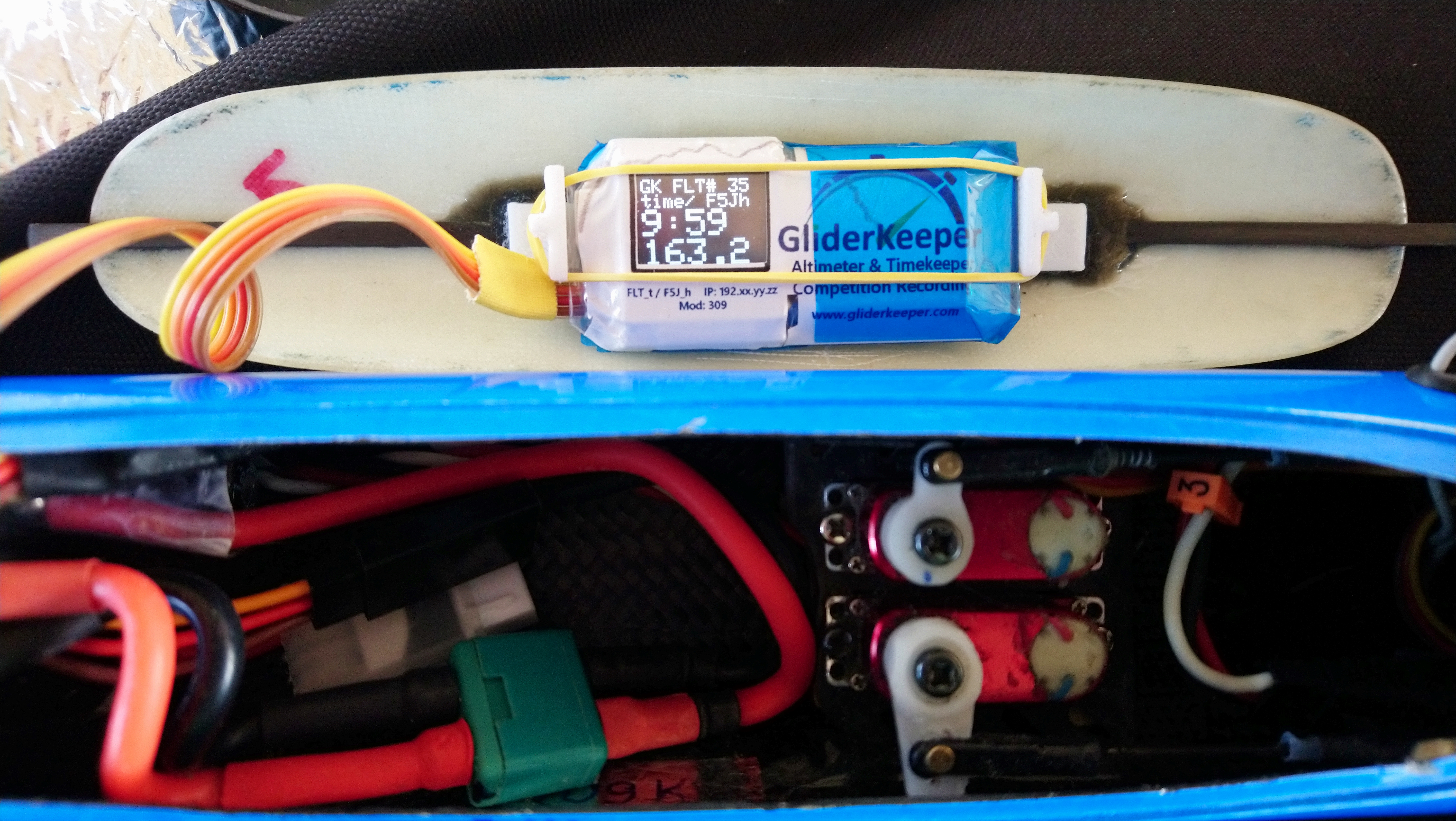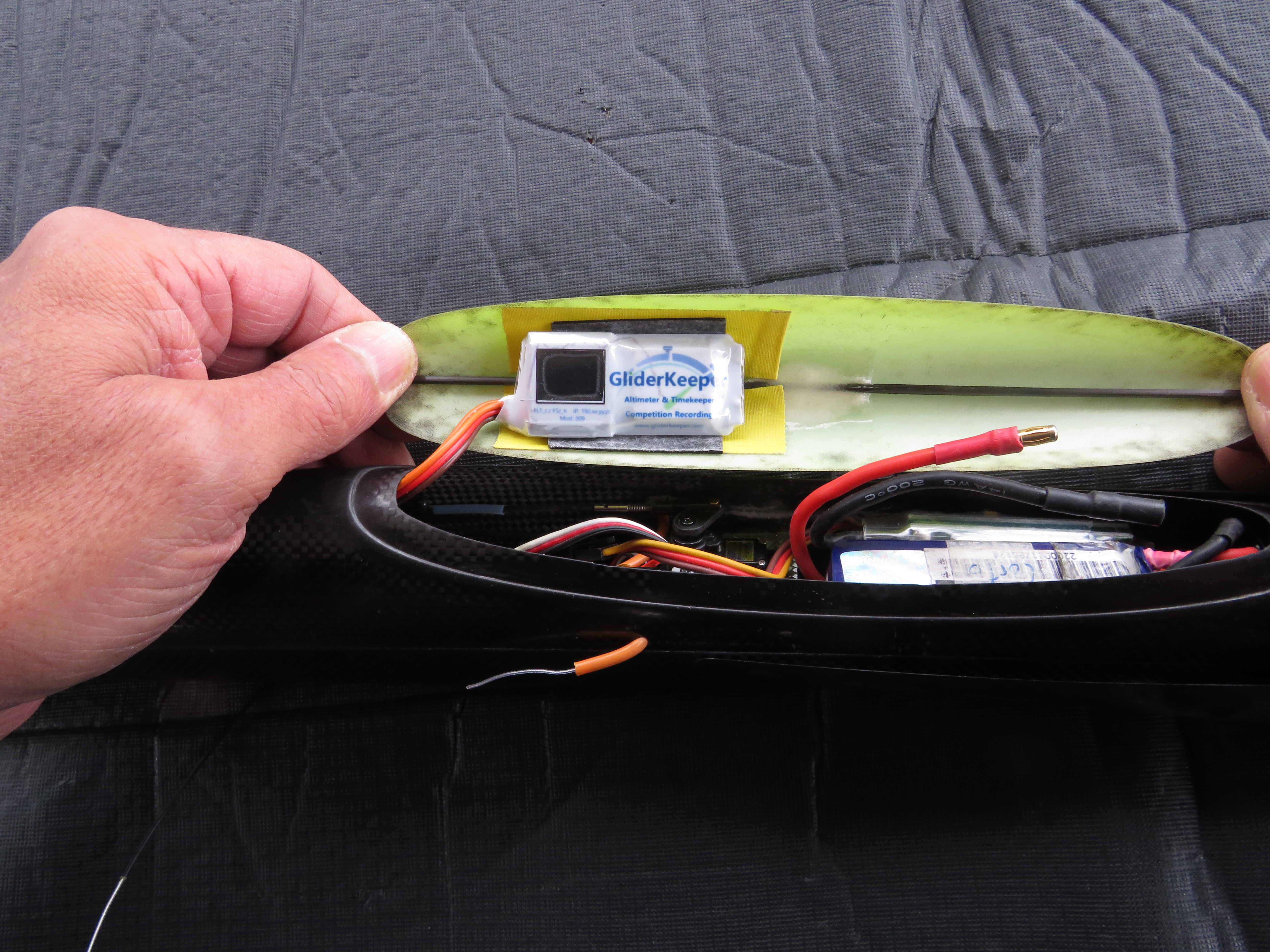 Con todos los altímetros tengo la costumbre de retirarlos de los aviones unas vez concluidos los vuelos con el objeto de ver en el ordenador los logs grabados de ellos y «entretenerme» analizándolos, con los GliderKeeper no iba a ser menos pero… las instrucciones dicen que el ‘chisme’ debe ir fijado al modelo y para ello acompaña un cinta adhesiva de doble cara (por cierto, de bastante calidad).