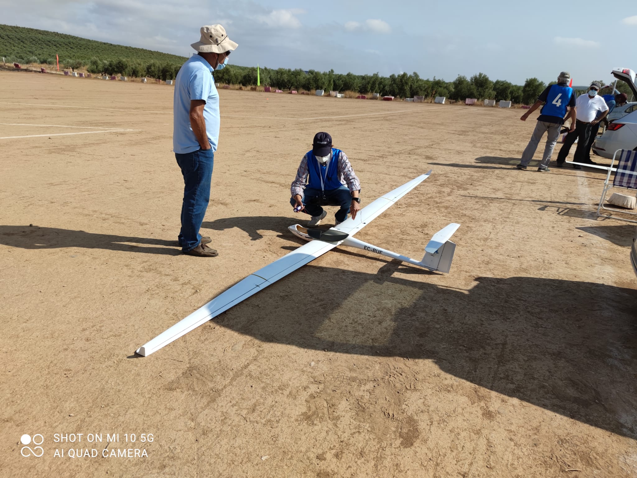 Respecto a Juan Fco. Sixte (dorsal 4), del Club Pacense de Aeromodelismo he sacado la conclusión que el de Cástulo no es su campo de vuelo mas óptimo, al fondo de la foto siguiente lo vemos ‘lamentándose’ junto a Pedro de su imposibilidad de participación