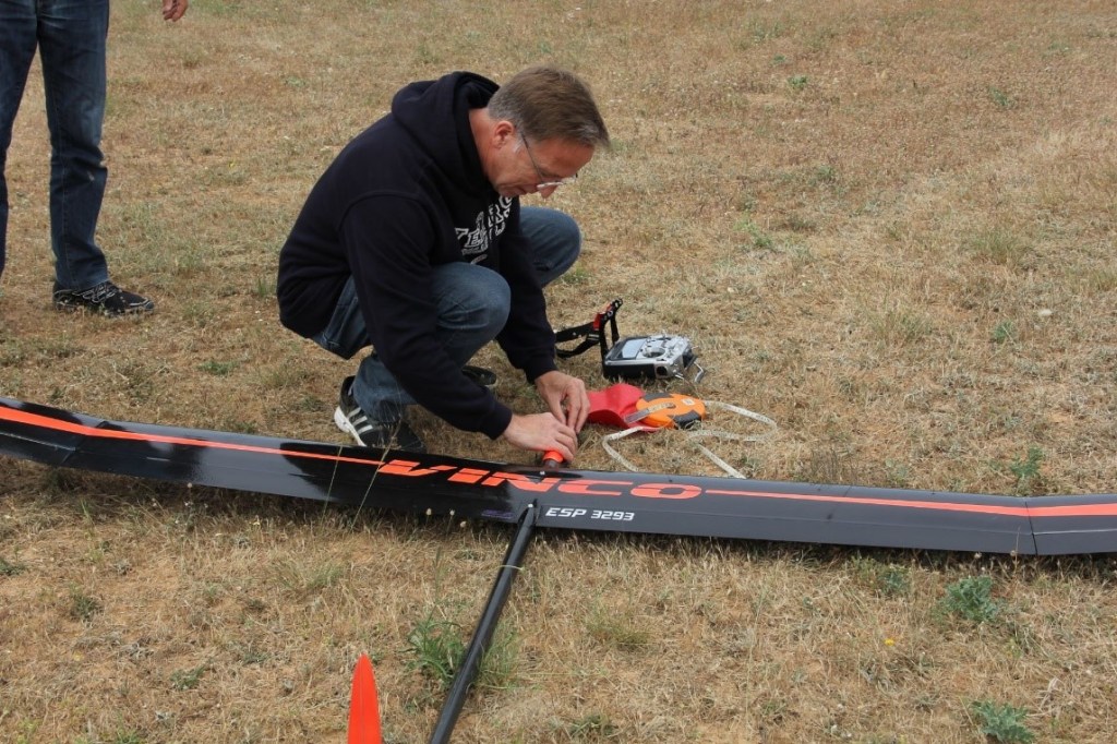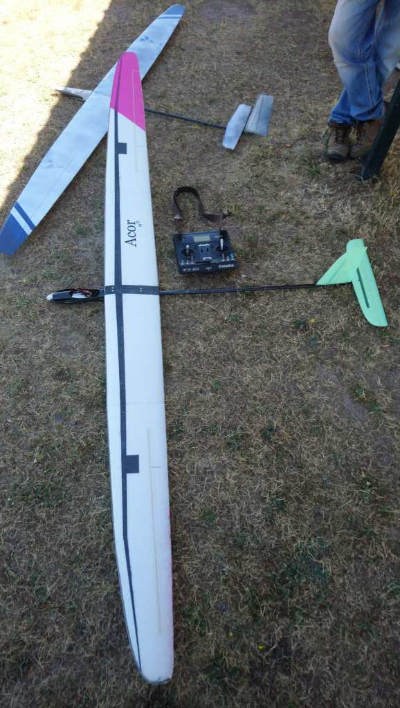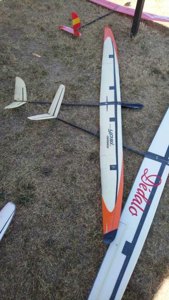 Jose Enrique, a falta de su «Queltehue» (por accidente reciente) voló su «Supra» y no le fue nada mal, aunque lo tenía un pelín ‘desentrenado’. A continuación quedaría Antonio Duro con su Vinco y en su primera toma, pasó por encima del centro asignado con tan mala suerte que la puntilla que lo fijaba, que se había salido de su sitio, le arrancaría un trozo de la fibra de vidrio en el intradós del ala, un poco de ‘fixo’ le permitiría seguir el vuelo, no sin el correspondiente dolor 😦 . Casi todos los pilotos tuvieron algunos vuelos espectaculares, cronometré una vez a Antonio Duro y, ya viniendo a aterrizar por dificultades de localizar térmica, a unos ocho-doce metros de altura se encuentra con ‘algo’ que le da un empujoncito hacia arriba a su modelo y, vueltecita a vueltecita, metro a metro aguanta hasta el final del tiempo de trabajo, mas de cuatro minutos ‘empujando’ con todo el cuerpo.