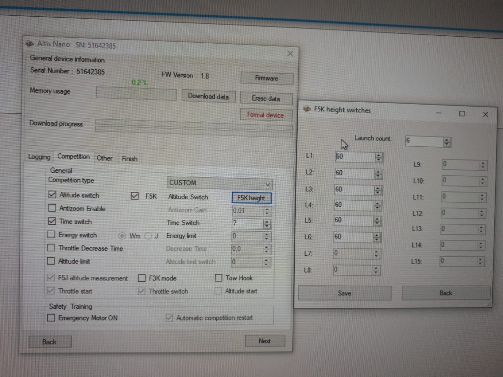 Las alturas de cada uno de los vuelos, en cada tarea son recogidas por el altímetro y es al final de la tarea cuando se anotan en las hojillas de puntuación. Por ahora, que sepamos el único altímetro preparado para esta modalidad es el Altis, en sus modelos V4 o Nano y el último FW para ello es el 1.8. Como en F5J, el altímetro hay que ‘activarlo’ en la zona asignada para el vuelo, en el suelo y en reposo. Es responsabilidad del piloto el funcionamiento correcto del altímetro y su parametrización.