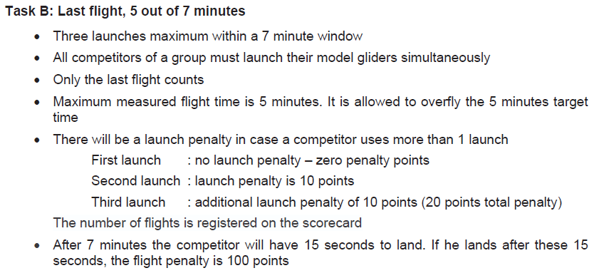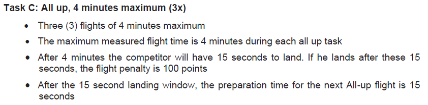 En la Tarea C se pretenden conseguir tres vuelos de cuatro minutos cada uno. Todos los pilotos han de lanzar el avión a la vez en el momento que suena la señal, en los tres vuelos. Después de los cuatro minutos tienen 15″ para la toma y hacerlo después penaliza con 100 puntos. Para el siguiente vuelo (2º y 3º) el tiempo de preparación es de 15″ en cada uno.