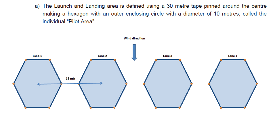 Todos los vuelos han de acabar en el suelo, dentro del hexágono asignado al piloto como ‘punto’ o «Área de Piloto», si ninguna parte del modelo se encuentra dentro del hexágono se penaliza el vuelo con 10 puntos y si el modelo queda fuera del campo de vuelo definido por el CD la puntuación del vuelo será cero(0). Es un hexágono de 5m de lado y la separación entre los centros de ellos debe ser de 15m. Por cierto, se despega y aterriza en la dirección que decide el DC.