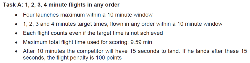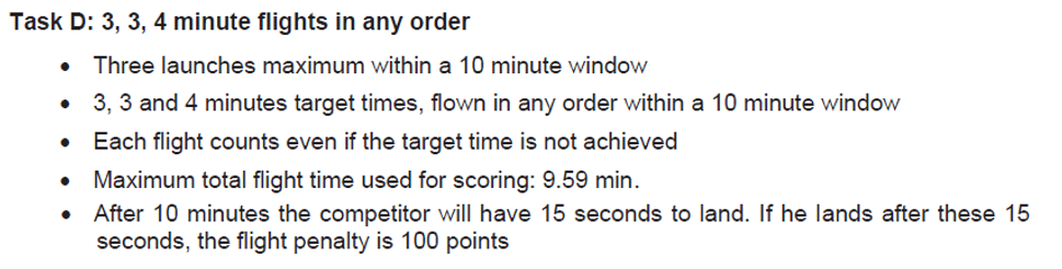 El objetivo es un vuelo de cinco (5) minutos en una ventana (o tiempo de trabajo) de siete (7) minutos. Todo lo que se vuele mas de los 300″ no valdrá para nada. El piloto tiene tres intentos para conseguirlos pero… sólo puntuará el último vuelo, sea el que sea (el mayor o el menor), además por cada nuevo intento habrá una penalización de 10 puntos. El crono se para cuando termina el tiempo de trabajo (7′) y si estas en vuelo después de quince segundo de esos siete minutos el vuelo se penaliza con 100 puntos.