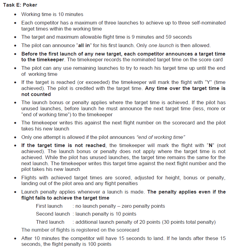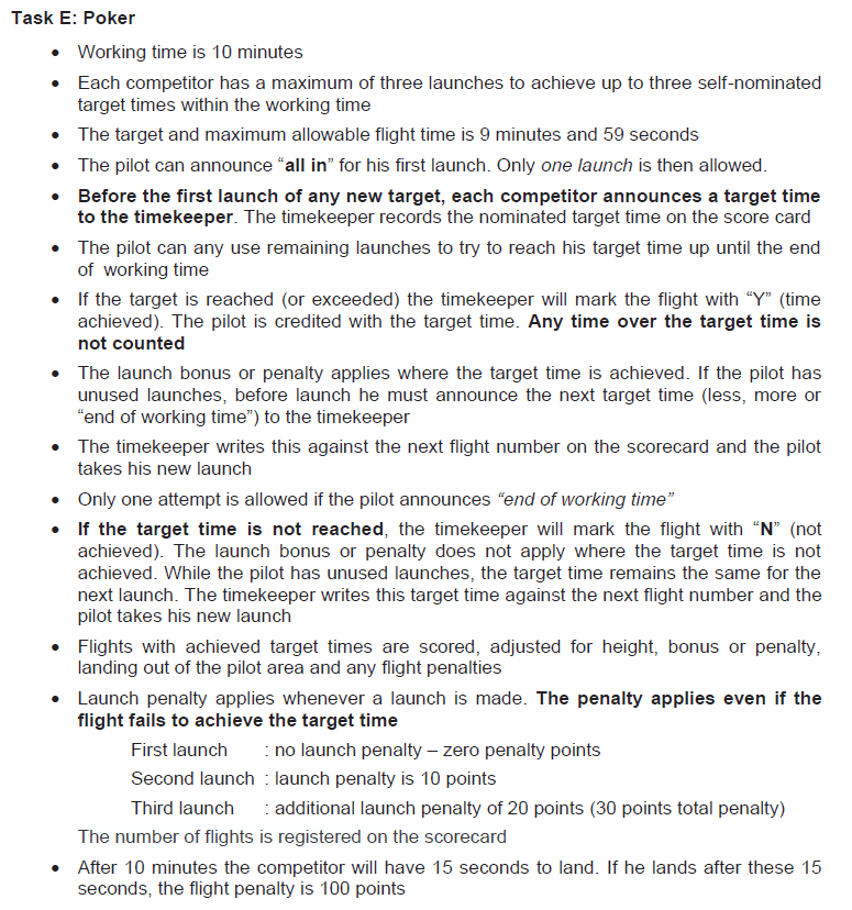 La quinta y última de las tareas posibles, la mas larga en su descripción. Aunque podría definirse como ‘hacer 9’59 en uno, dos o tres vuelos‘, con la particularidad que antes de despegar hay que decirle al cronometrador que tiempo se va a hacer, éste lo anotará y sólo lo dará por válido si el objetivo es alcanzado. Caso de no alcanzarlo deberá repetir el vuelo para el mismo ‘objetivo’. Si se solicita «all in» sólo podrá realizar un vuelo. Cada a vuelo adicional tendrá una penalización de 10 puntos y si el objetivo no es alcanzado no se tendrá en cuenta el tiempo realizado para la puntuación y caso de disponer de algún vuelo más no podrá cambiar el objetivo a conseguir.
