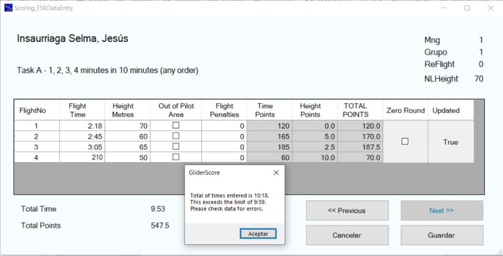 En la denominada «TAREA A» el objetivo es conseguir cuatro vuelos de una duración, cada uno de uno (1), dos (2), tres (3) y cuatro (4) minutos en el orden que creamos conveniente. Si el tiempo de trabajo o ventana de vuelo es de diez minutos es de cajón que los cuatro no se pueden realizar completamente, porque, para mas inri, el tiempo total de vuelo que se va a puntuar es de 9’59» (nueve minutos y cincuenta y nueve segundos). Para las puntuaciones usaremos la aplicación GliderScore y os puedo asegurar que sabe sumar y no permite que la anotación de los tiempos realizados en los vuelos supere los 9’59»