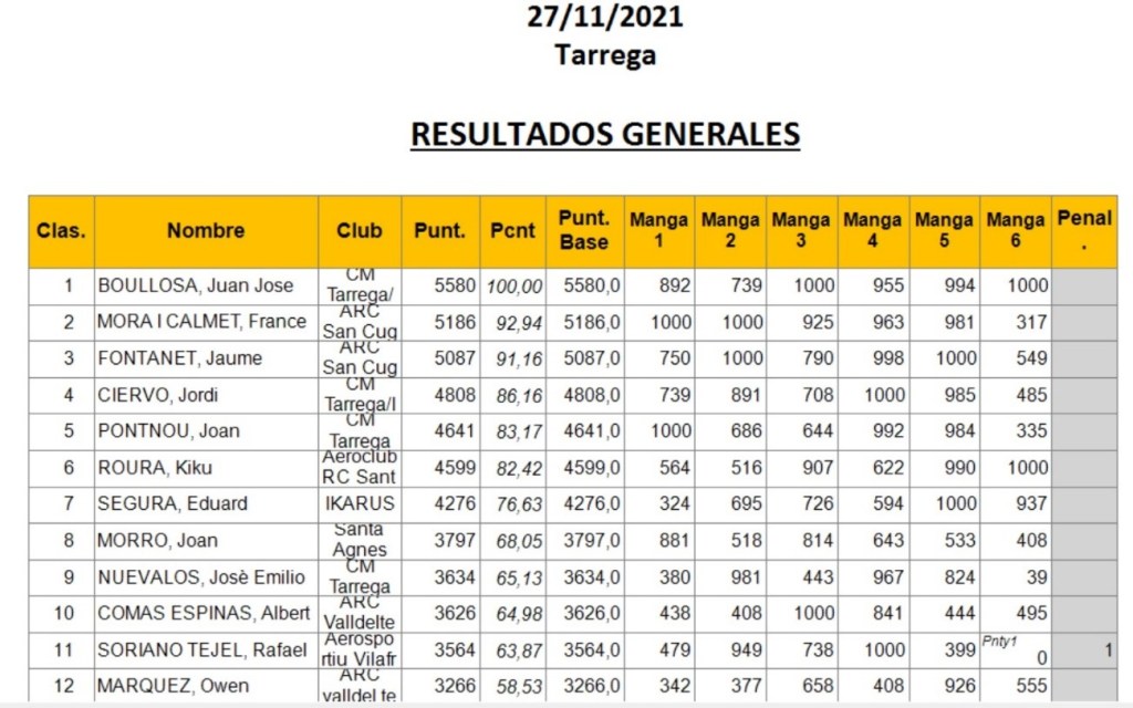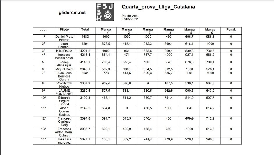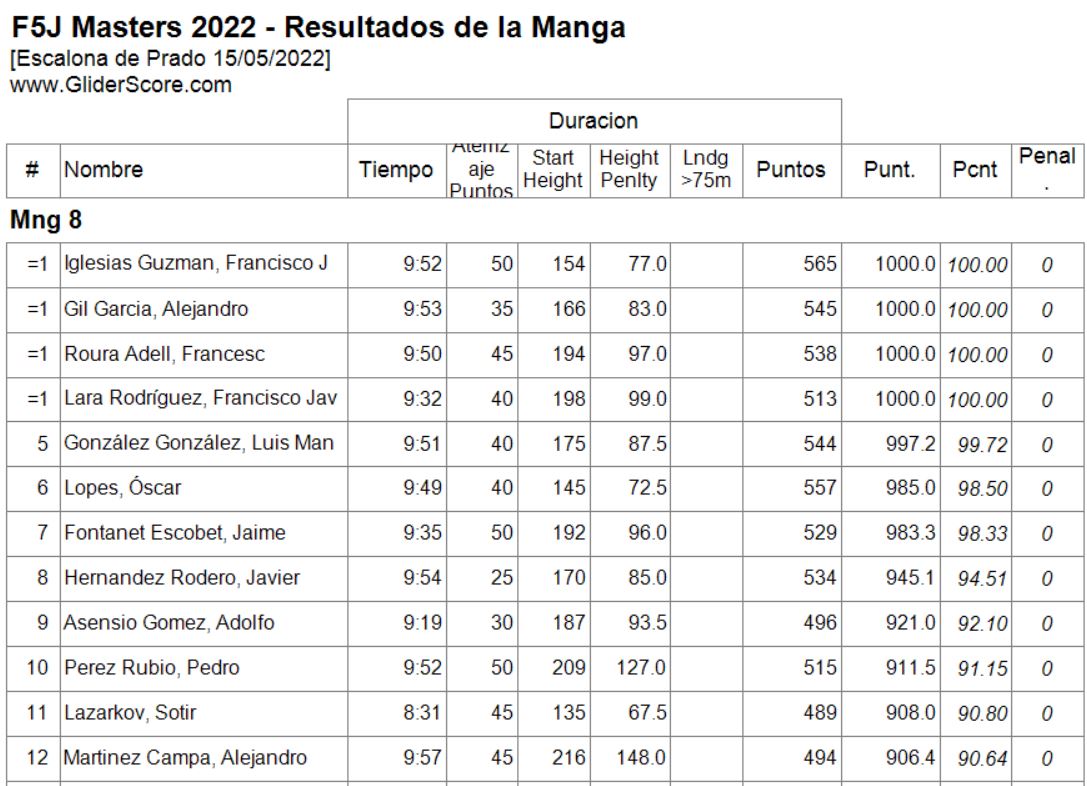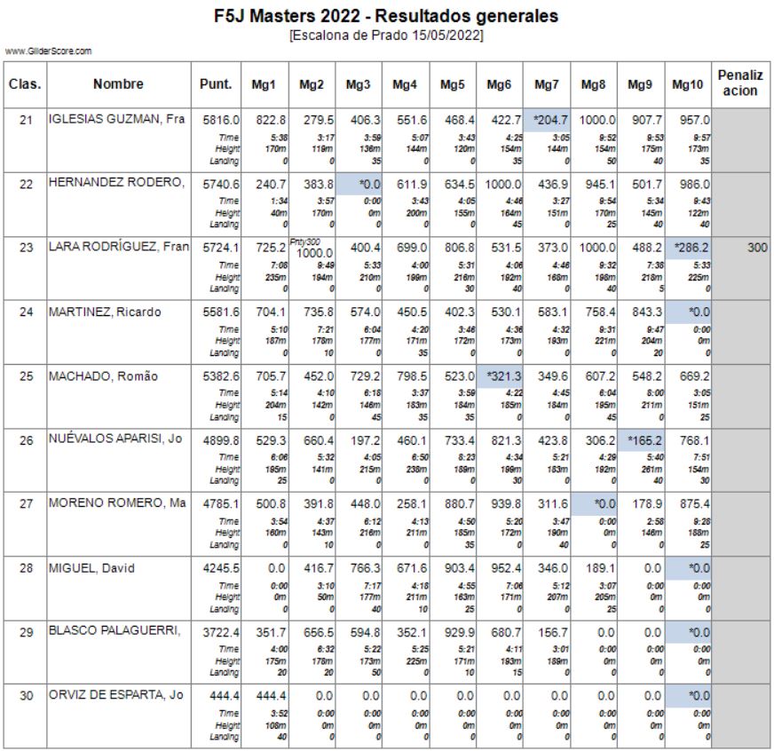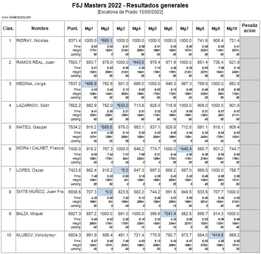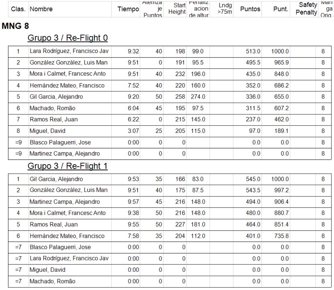 Conforme a la reglamentación se eliminaría el peor de los vuelos realizados (los marcados en la lista) por cada piloto y las penalizaciones lo serían por invasión de la zona de seguridad o fallo en el lanzamiento.