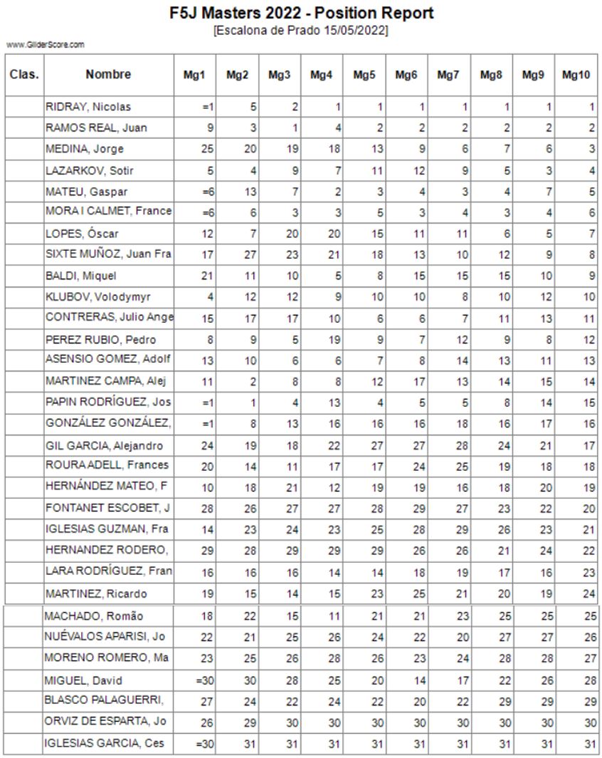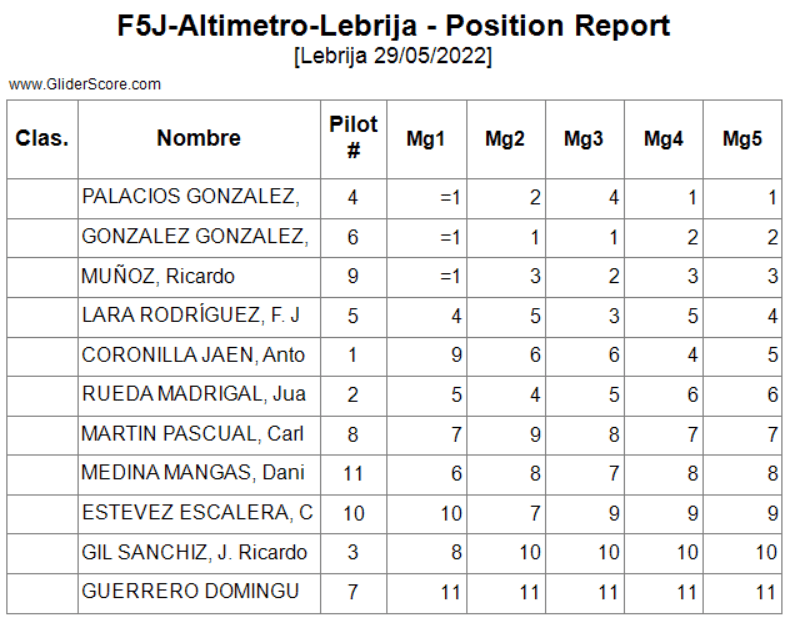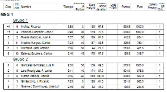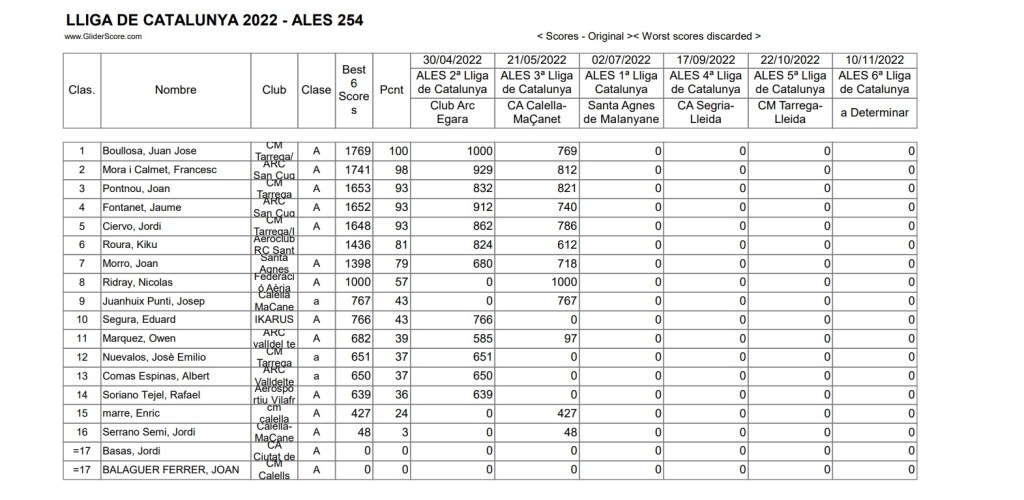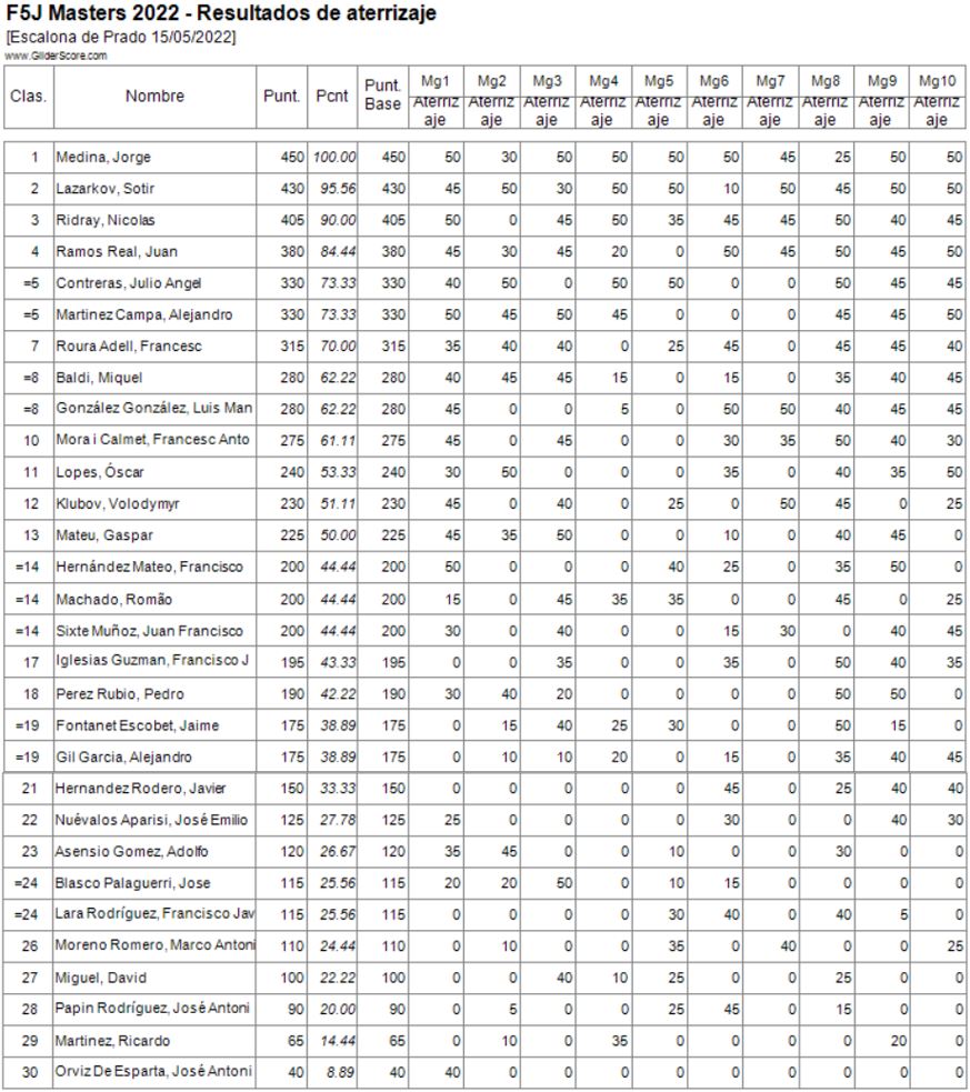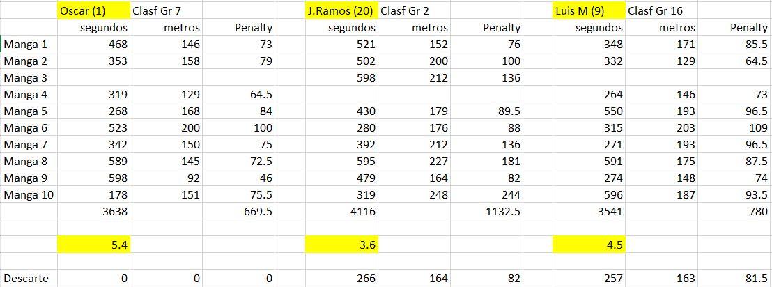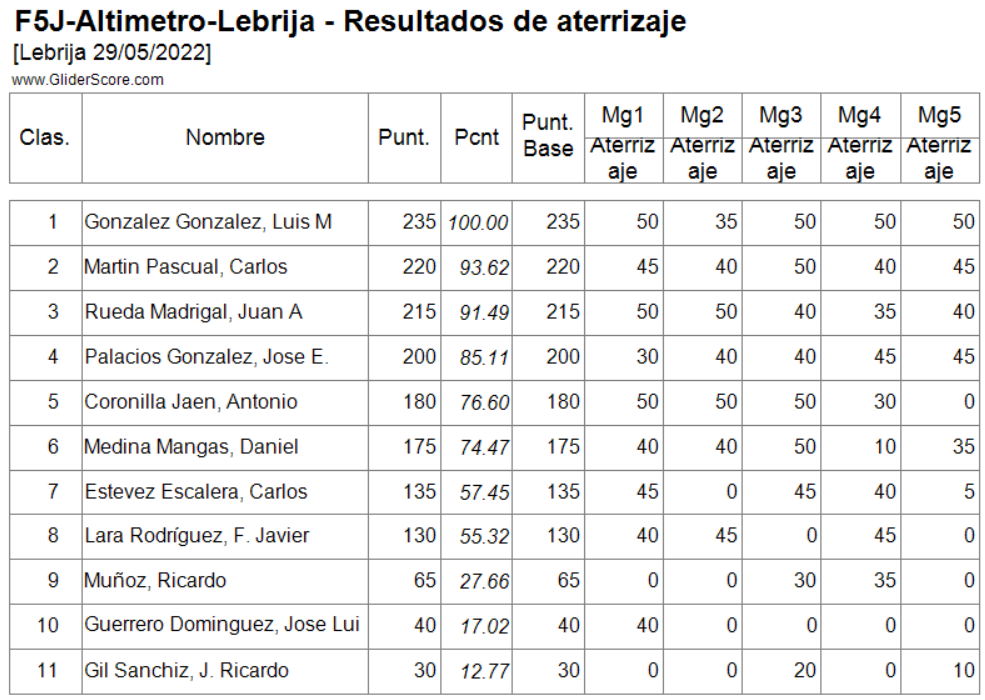 Conforme a la reglamentación se eliminaría el peor de los vuelos realizados (los marcados en la lista) por cada piloto y las penalizaciones lo serían por invasión de la zona de seguridad o fallo en el lanzamiento.