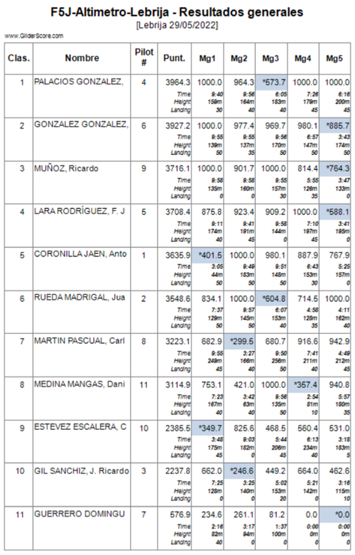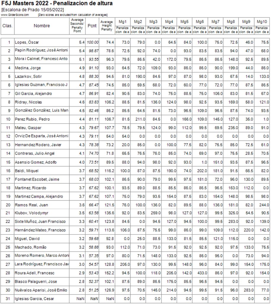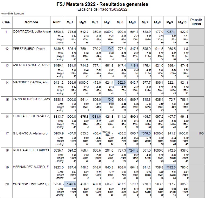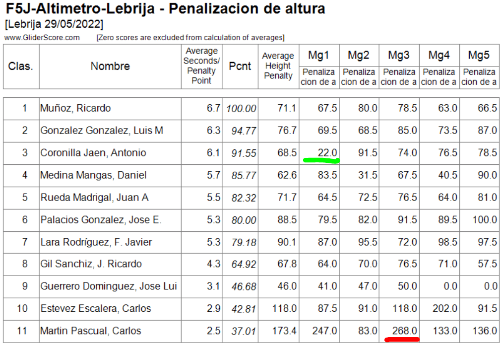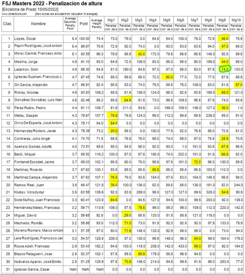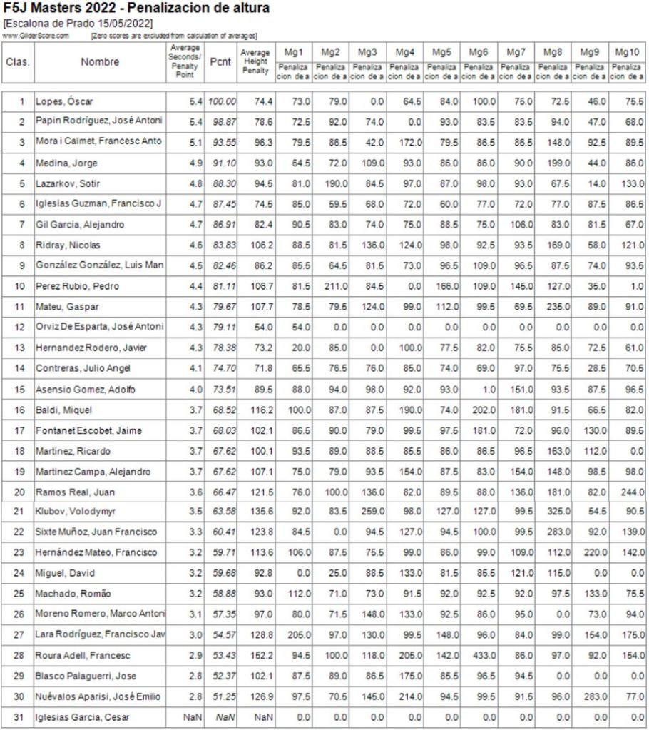 Otro ‘termometro’ de la competición (bajo mi punto de vista del disfrute) es la «altura de partida» de los vuelos… Las máximas penalizaciones fueron 433.0 puntos seguidas de 325.0 y, en dos ocasiones y diferentes pilotos, 283 puntos de penalización