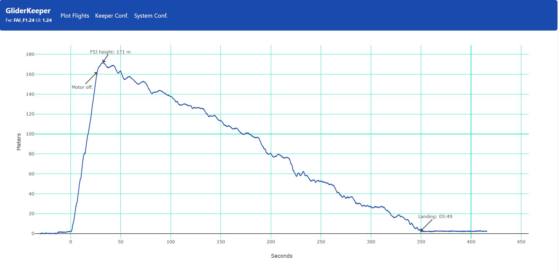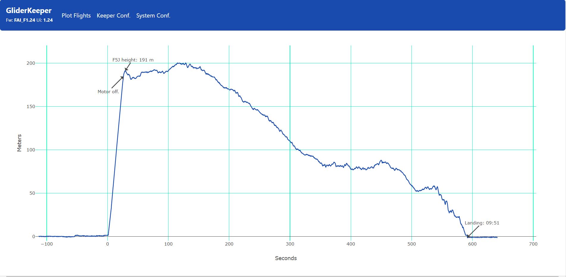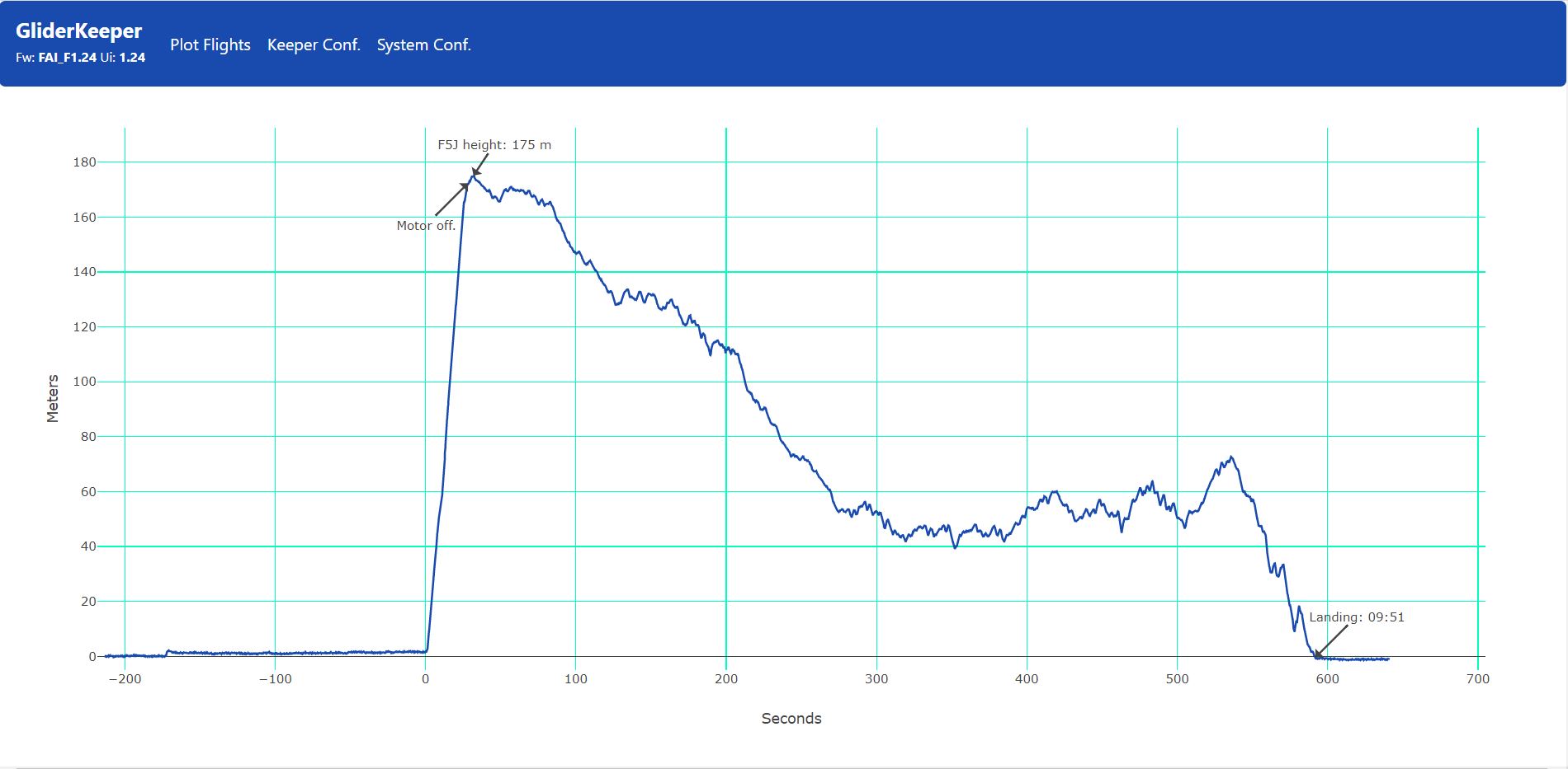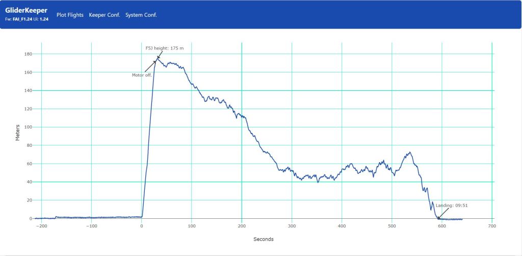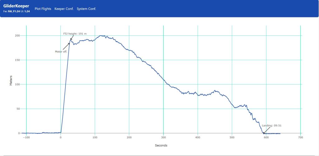 Me apunté a la repetición del vuelo del grupo 3 de la manga 8 dado que hubo un toque entre dos modelos y se pidió re-fly… Curiosamente el tiempo de mi vuelo fué el mismos en ambos (9:51) pero en la repetición la altura de partida sería inferior 175 vs 191 y también se mejoró la toma -2 vs +10; pero la mejora de puntuación no sería lo mejor del vuelo, la gráfica de la izquierda es el vuelo original y la de la derecha la repetición; en el primero mas ‘apretado’ que todas las cosas para acercarme a los 10′, en el segundo no lo di por perdido y la segunda mitad disfrute mas que un niño con juguete nuevo