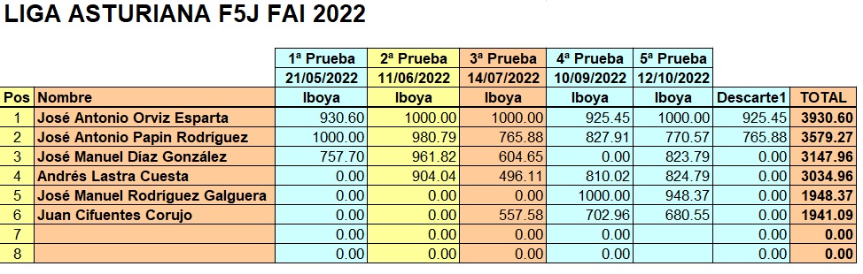 La clasificación final de la Liga, con 5 pruebas realizadas y descartándose el peor resultado quedó como se puede ver en el cuadro adjunto.
