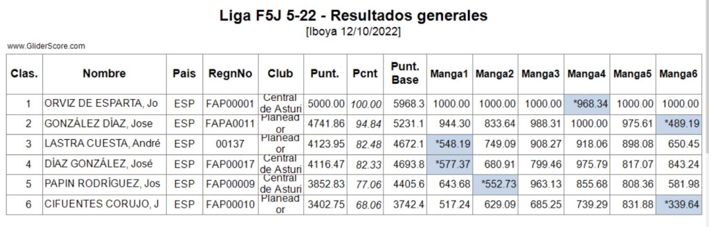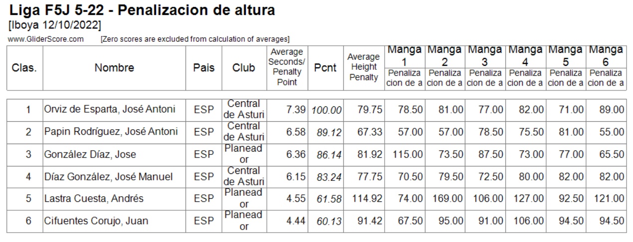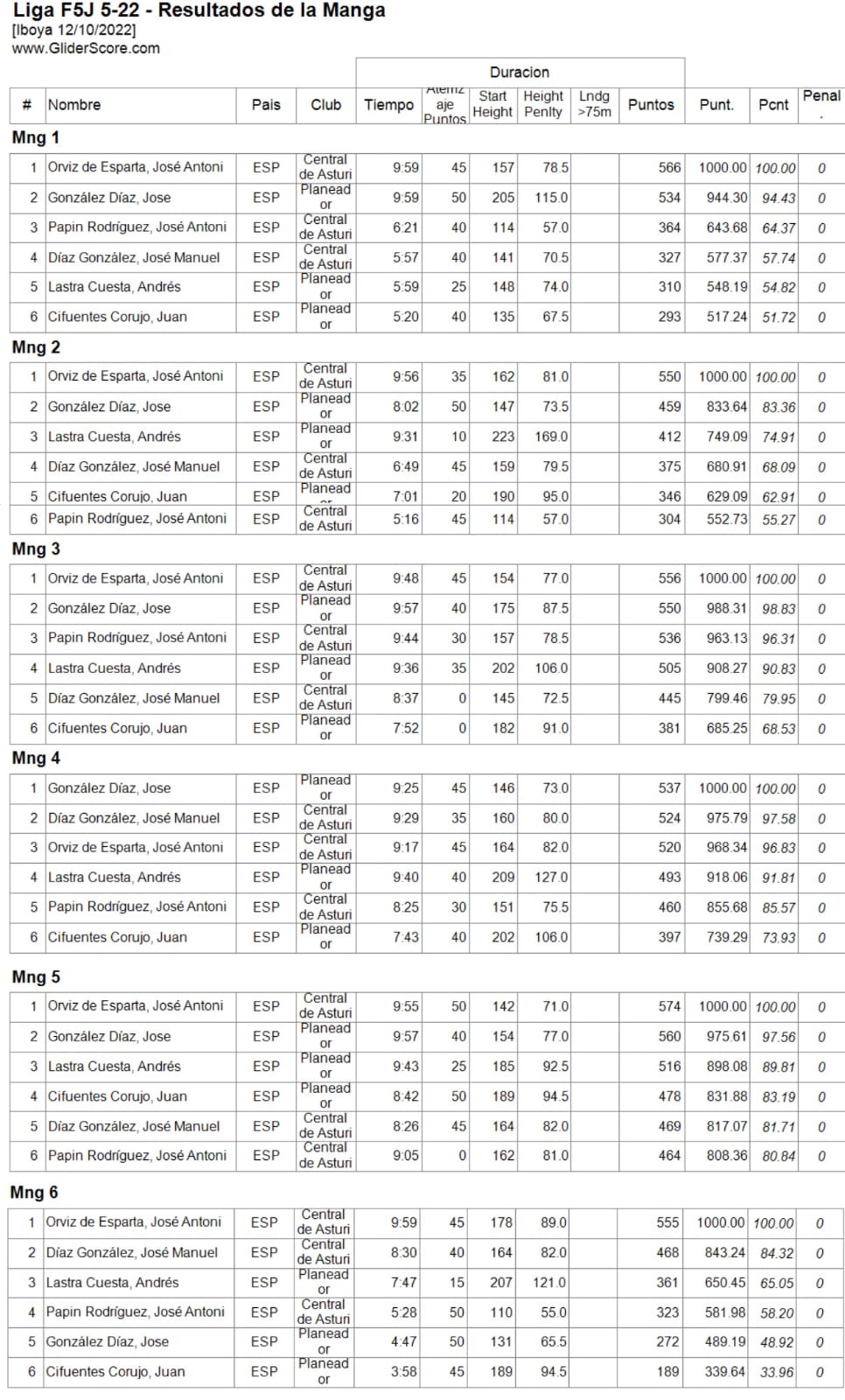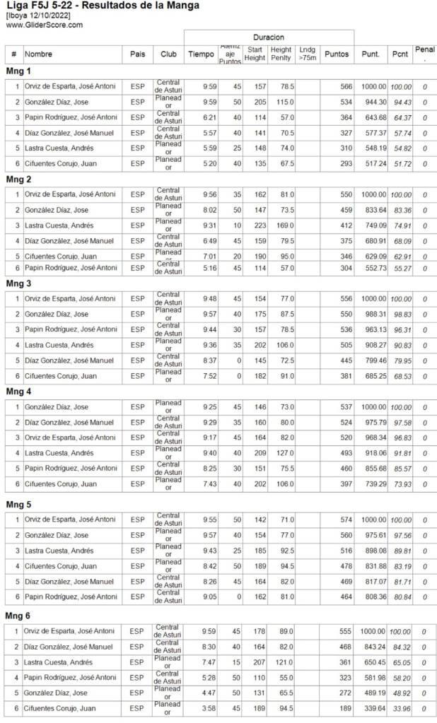 En estas circunstancias varios de los pilotos optaban por alturas de corte altas, otros algo bajas, si bien uno de los pilotos, se decidió por hacer cortes medios, por encima de 140 metros pero sin llegar a 180 en ninguno, lo que le permitió alcanzar el tiempo máximo de vuelo en 5 de los 6 vuelos, anotándose el codiciado mil en todos ellos y por tanto la victoria final en la prueba, así Orviz repetía victoria en la Liga un año más.