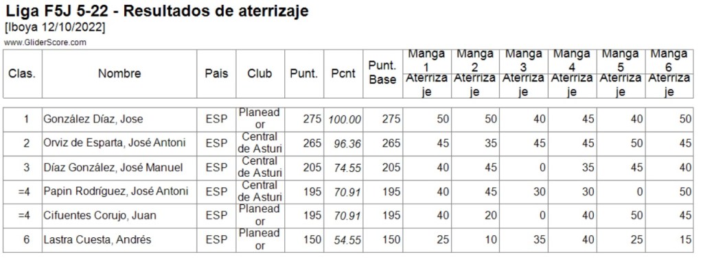 Muy buen concurso del casi debutante Jose González, fue el mejor en los aterrizajes, muy buenos vuelos, solamente penalizados por alturas de corte algo altas en algunos de ellos. En tercer lugar Andrés Lastra, sin tanto acierto en los aterrizajes y con alturas de corte demasiado altas en varios vuelos, en líneas generales también un buen concurso, hay que tener en cuenta que también es aún bastante nuevo en la fórmula, pero va subiendo el nivel notablemente, aunque aún le falta va consiguiendo afinar algo más en los aterrizajes. En cuarto lugar José Manuel Díaz, apostó por alturas de corte moderadas, sobre 160, si bien no pudo completar el tiempo de vuelo en ninguno, mejorando bastante los aterrizajes con relación a otros concursos. En quinto lugar Papin, en la mitad de los vuelos apostó por cortes ligeramente por encima de los 100 metros, demasiado arriesgado con las condiciones que había. Cerrando la clasificación Juan Cifuentes con alturas de corte algo altas sin ser excesivas, pero sin lograr acercarse demasiado al tiempo de vuelo deseado.