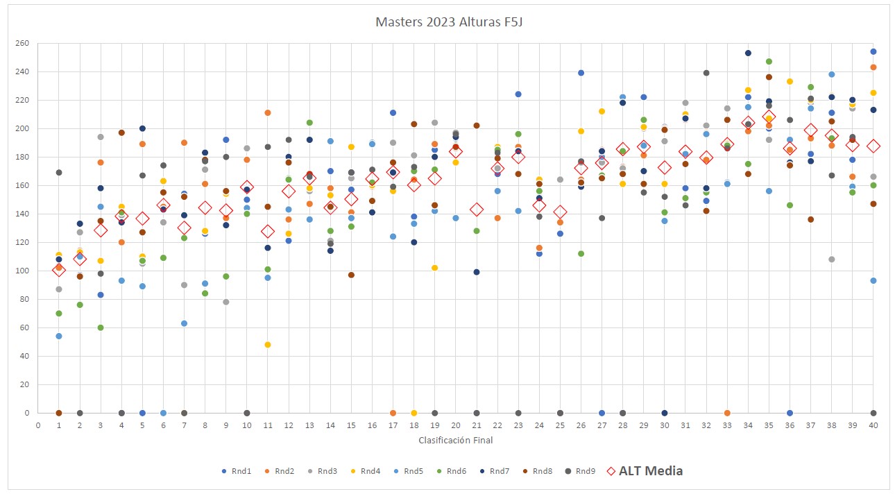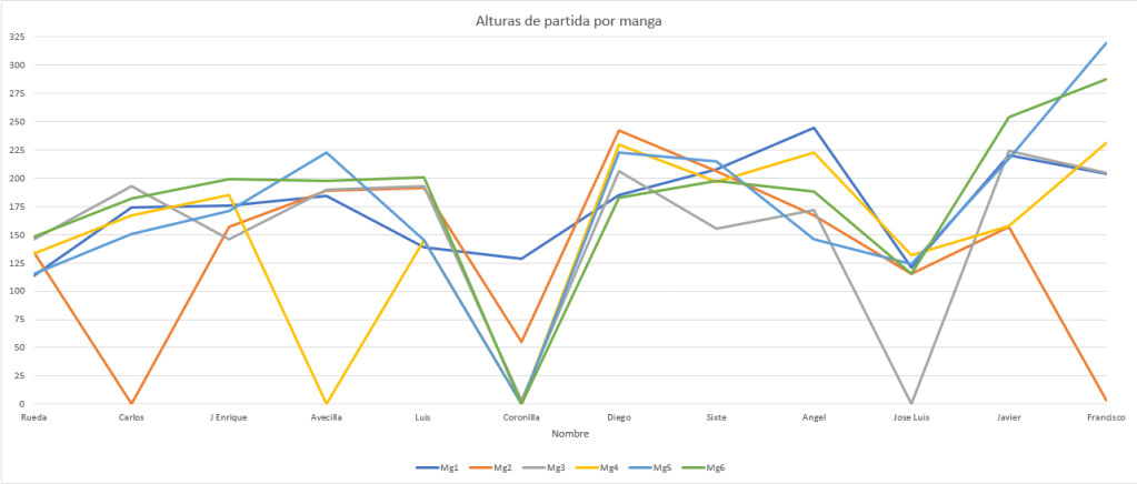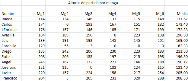Las alturas de partida fueron cambiando durante el transcurso de los vuelos, aunque hubo pilotos que mantuvieron bastante igualadas todas ellas… Jose Luis o Juan Rueda pueden tomarse como ejemplo en ello (el cero de Jose Luis no es porque no volara sino porque le fué anulado el vuelo por aterrizar a mas de 75metros)