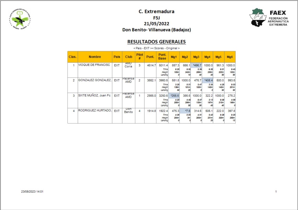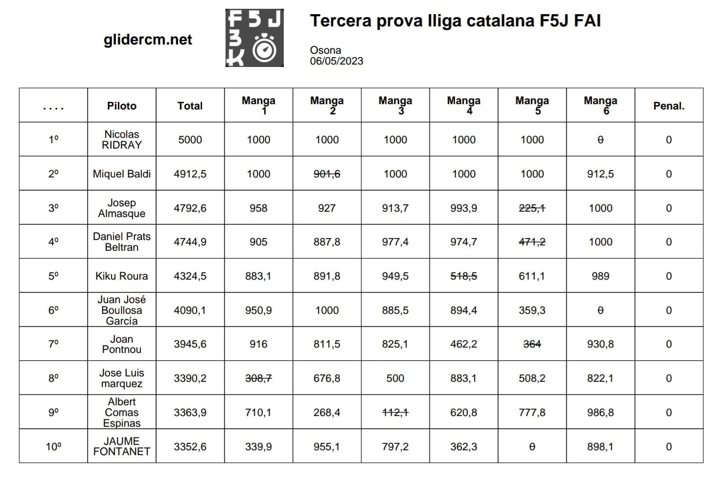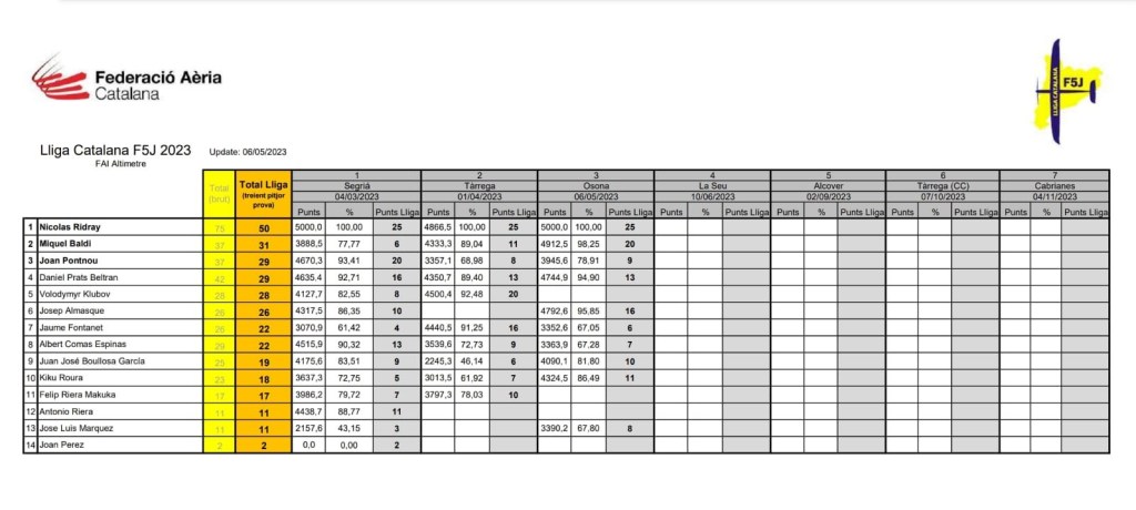 Clasificación correspondiente al 4º concurso de la Liga F5J Pep Martín 2023 de Mallorca, disputada el pasado Domingo 7 de Mayo de 2023 en nuestro campo de vuelo.