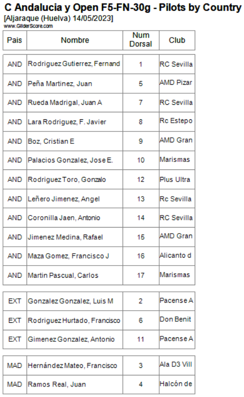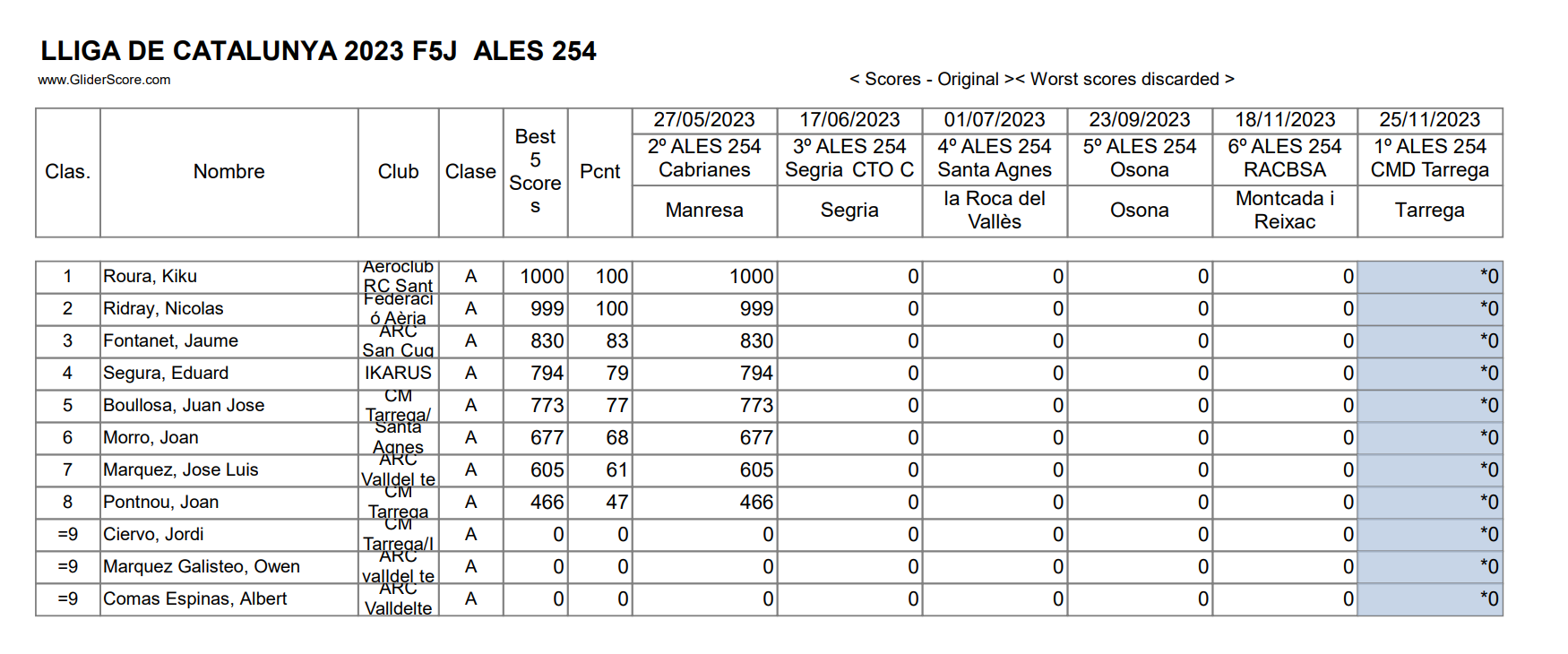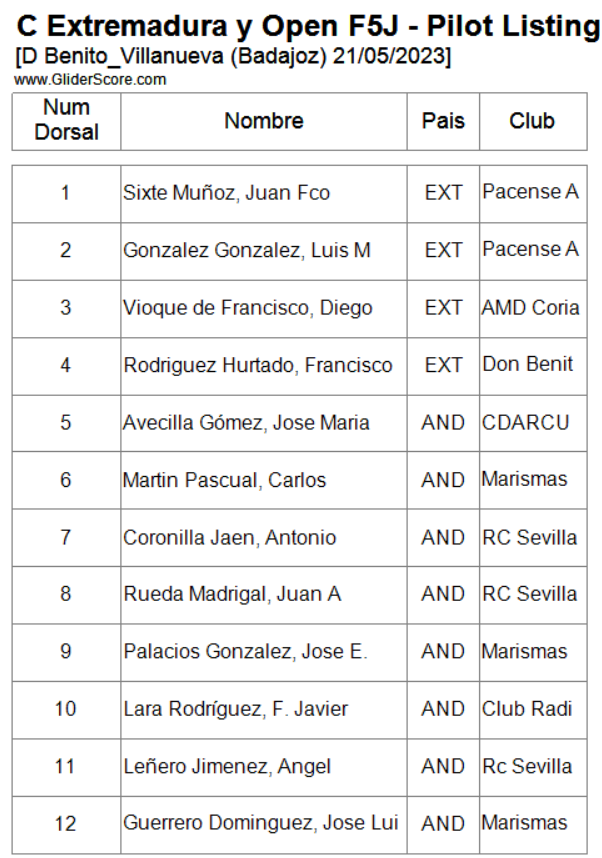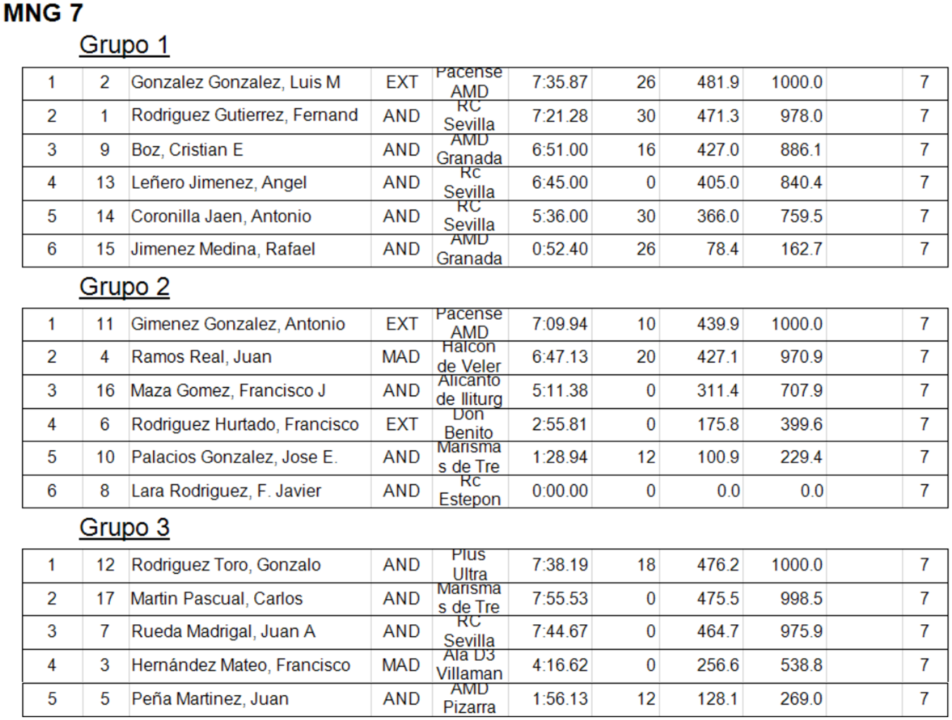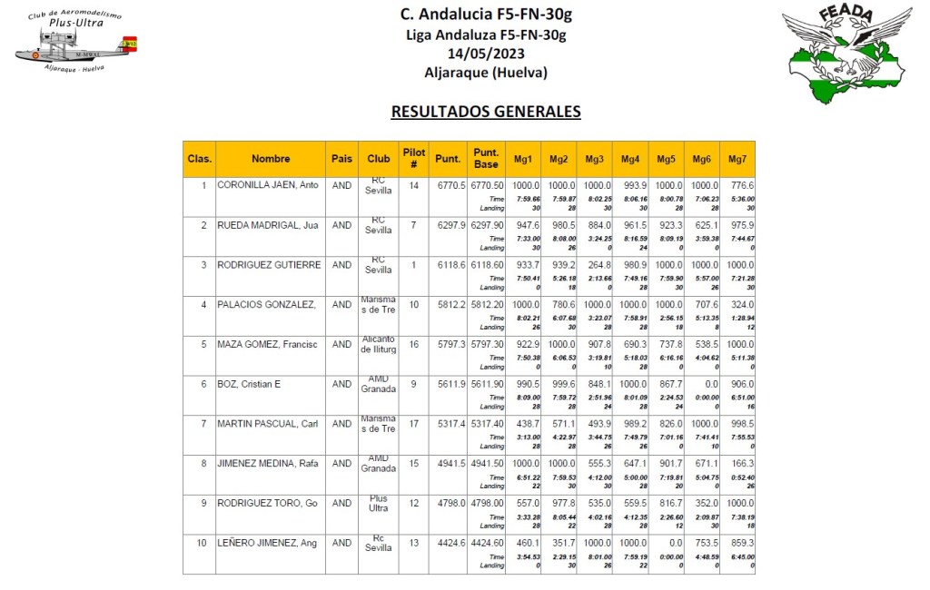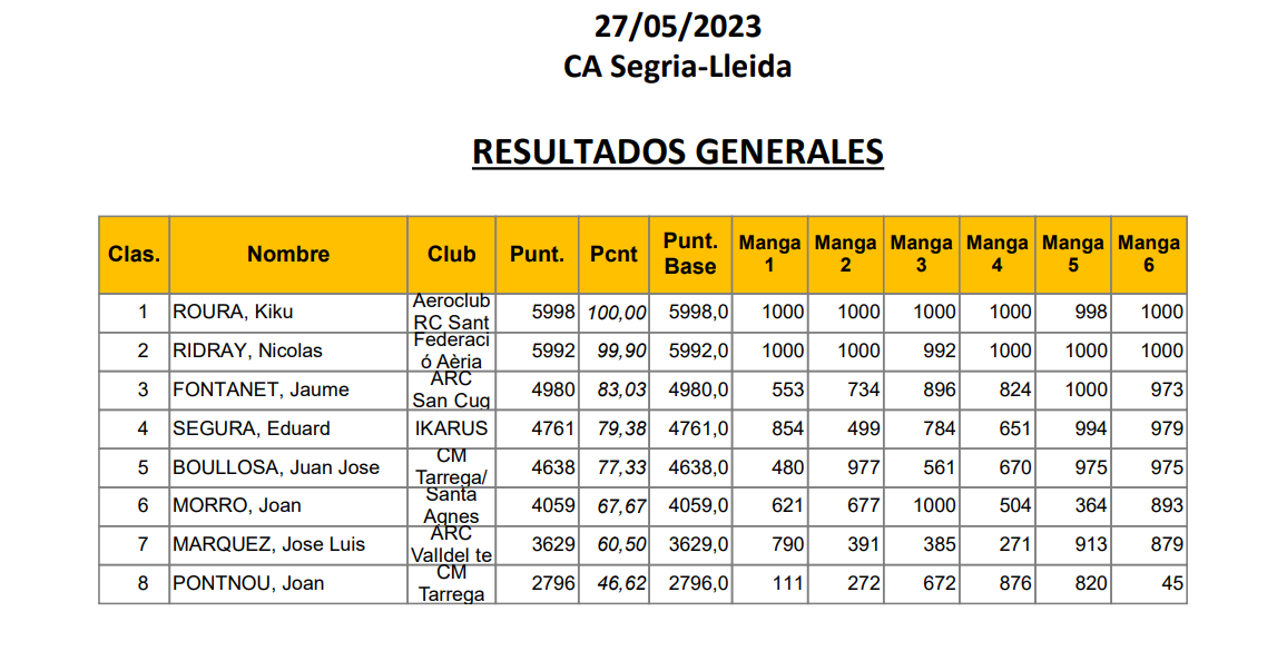Hasta la Manga 3 Coronilla y Luis obstentarian la primera plaza con 3000 puntos ambos, a partir de ese vuelo Coronilla mantendría la posición y Luis pasaría al segundo puesto e incluso el tercero después del sexto vuelo, recuperando ese segundo puesto en el séptimo, Juan Rueda los seguiría de cerca junto con Fernando Rodriguez y Juan Ramos que iría subiendo y aguantando posición en el transcurso de los vuelos. José Enrique perdería fuelle a partir del cuarto vuelo habiendo tenido un comienzo bastante regular además de bueno. Muy buen comienzo de Cristian, manteniendo puestos de cabeza hasta la cuarta manga (3º) pasando a la cuarta en el siguiente vuelo al ser sustituido por Jose Enrique seguido muy de cerca por Juan Rueda.