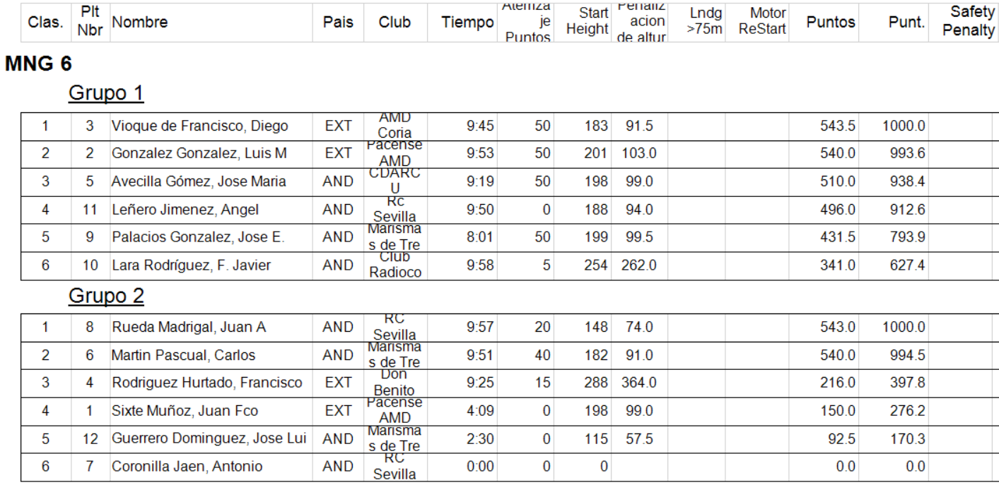 En los grupos dos y tres de ésta primera manga serían mas los que se acercarian e incluso sobrepasarian los ocho minutos objetivo de cada vuelo y que sin querer ser pesado pero para conocimiento de todos, es lo que se pretende en esta categoria, realizar siete vuelos de ocho minutos en nueve de trabajo, intentando aterrizar los más cercano al punto asignado para la toma, con un máximo de 480 puntos por el vuelo y 30 por la toma; y todo ello (los siete vuelos) con una única pila 2S para la alimentación del motor de un peso máximo de 30g, sí 30g y 2S.