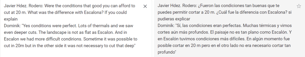 En este video https://youtu.be/_InIgT0sEQo tenemos un resumen de lo acaecido el domingo en la pista, pero hubo cosas que cuestan trabajo de creer; comentaba de lo de termicones y descendencias descomunales y quedó patente al ver las gráficas de algunos de los vuelos y la propia experiencia, tan ‘agustitooo’ a bastante altura y de repente sin comerlo ni beberlo y mucho menos quererlo, el modelo empieza a bajar y ni barriguita, ni riñones, ni nada que hiciera que se estabilizara, perdió la mitad o mas de la altura a la que estaba. Pero no fué la bajada mas pronunciada la mia, Jose Enrique perdería el velero haciendo una traslación entre nubes y cuando lo encontró… bueno lo escuchó… estaba a unos 50m; y digo «lo escuchó» porque localizó el modelo por el ruido que venía haciendo (flutter), consiguió estabilizarlo e incluso seguir el vuelo.