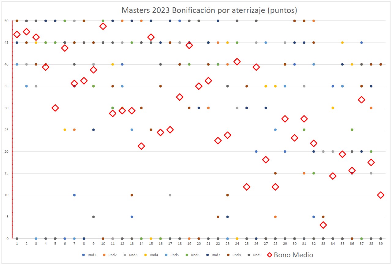 La minima penalización fué de 24 puntos (48m) y la máxima 262 (254m) pero ninguno de los vuelos fué afortunado, uno puntuó 207.9 y el otro tan sólo 38.1. La altura influye, pero no es fácil administrarla siempre.