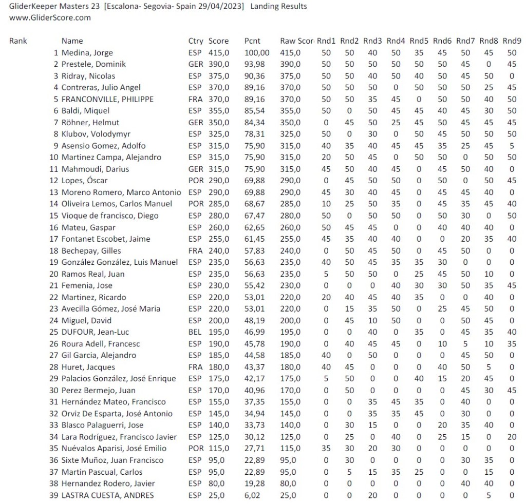 Nico como suele ser habitual no nos dio un respiro. Tras su reciente victoria en el Masters de Segovia, venia pisando fuerte. Los cortes bajísimos en torno a los 50m, directamente en las térmicas y acabado lejos y alto. Y eso que no tiene aún su nuevo modelo (Vertigo2) por la mano. 5 miles en las 5 primeras mangas hizo que pudiera arriesgar aún más en la última. Esta vez se fue muy lejos a sotavento pero no consiguió volver al campo. Una pequeña excursión se ganó.