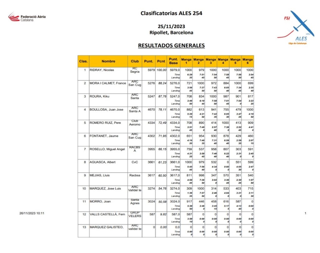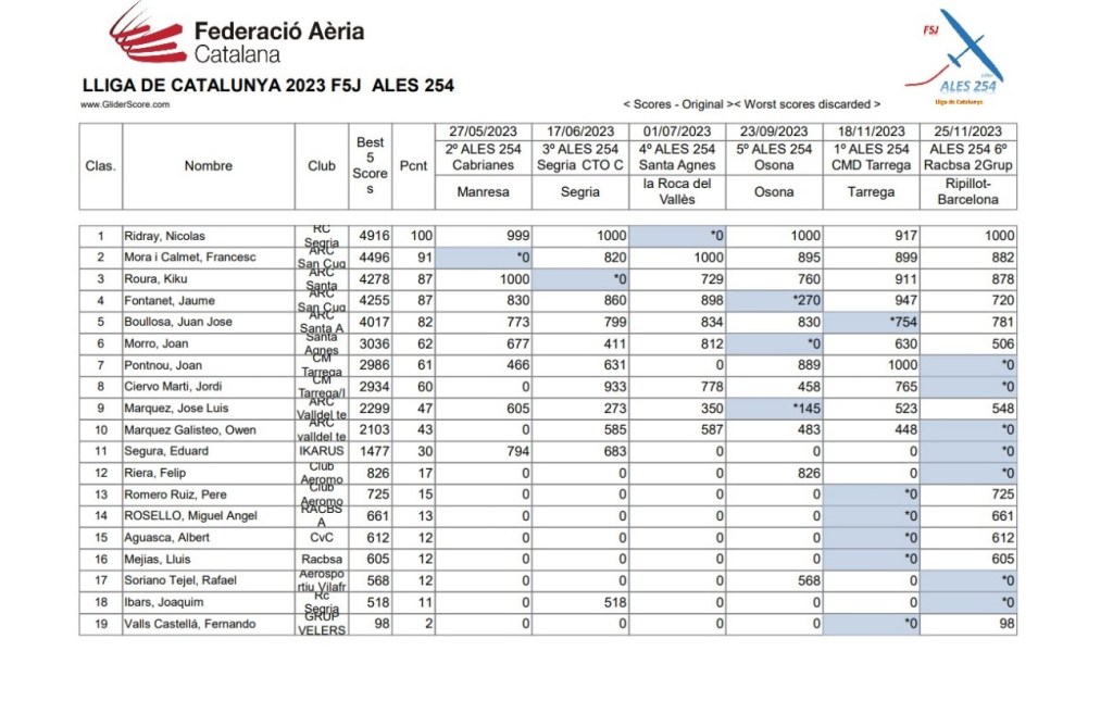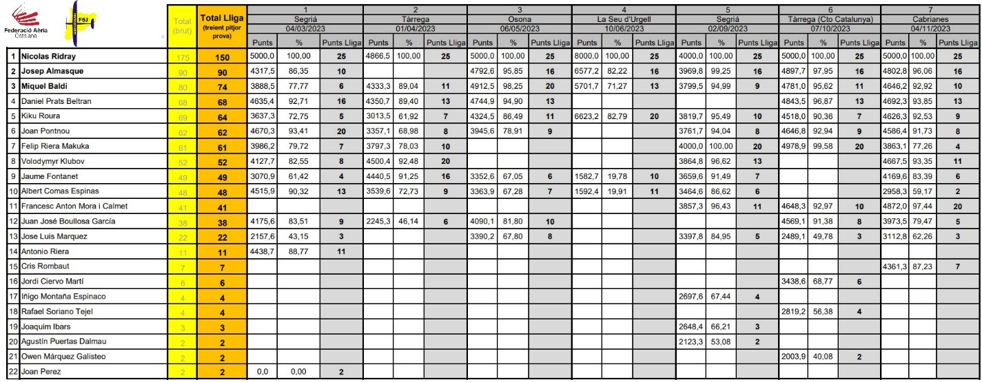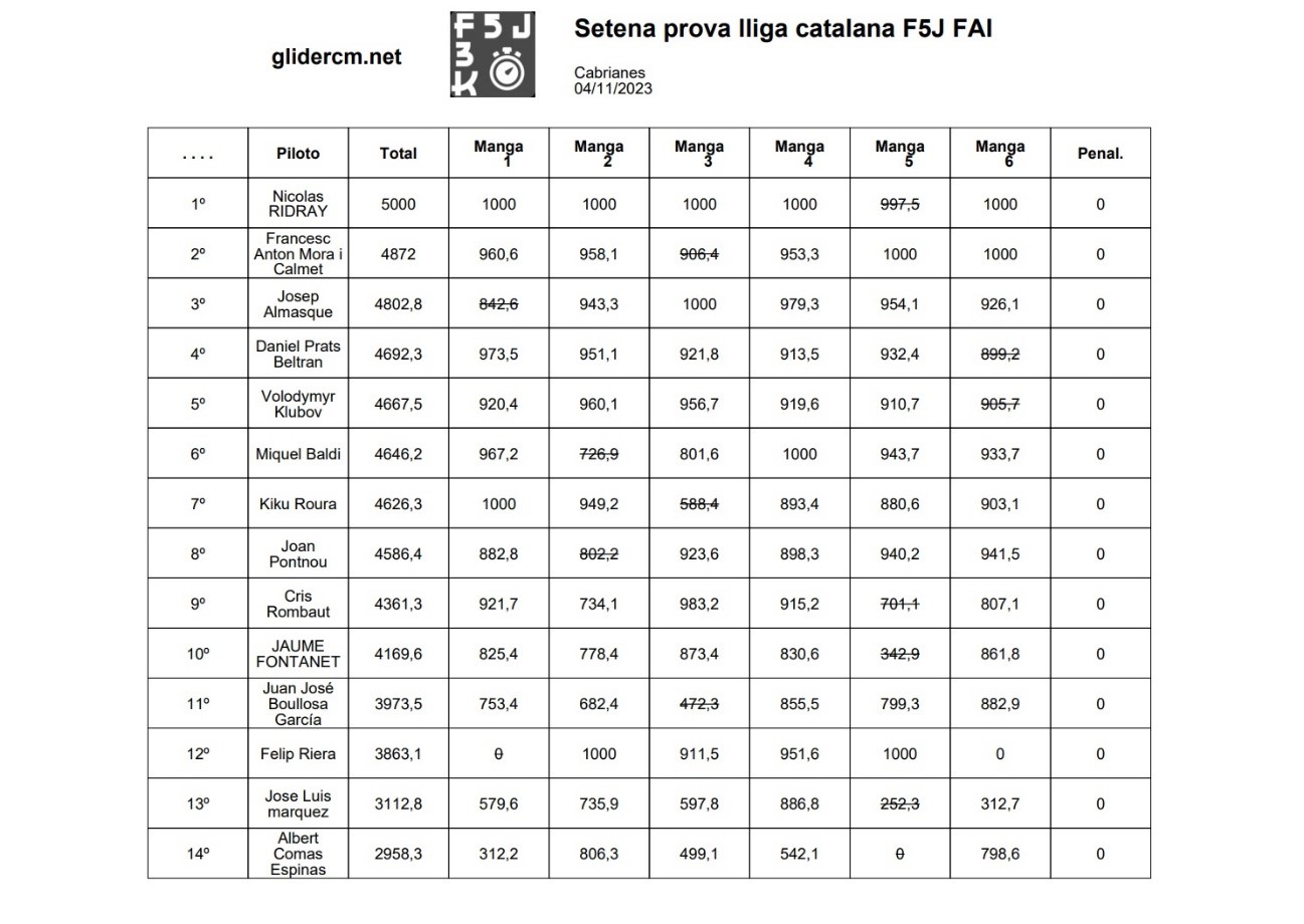 Una vez hecho el podio se procedió a recalcular la Liga de Cataluña F5J 2023 , resultando así la clasificación: