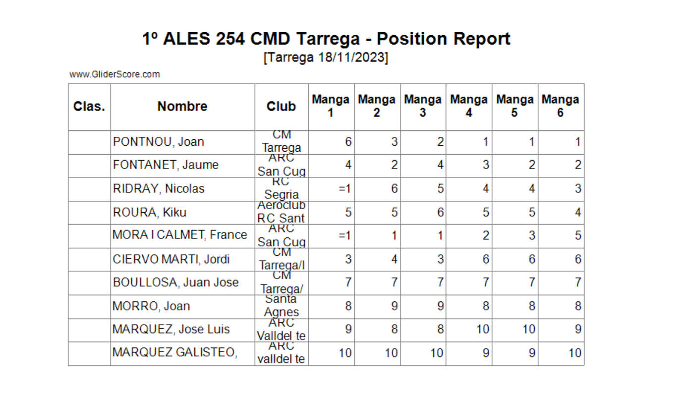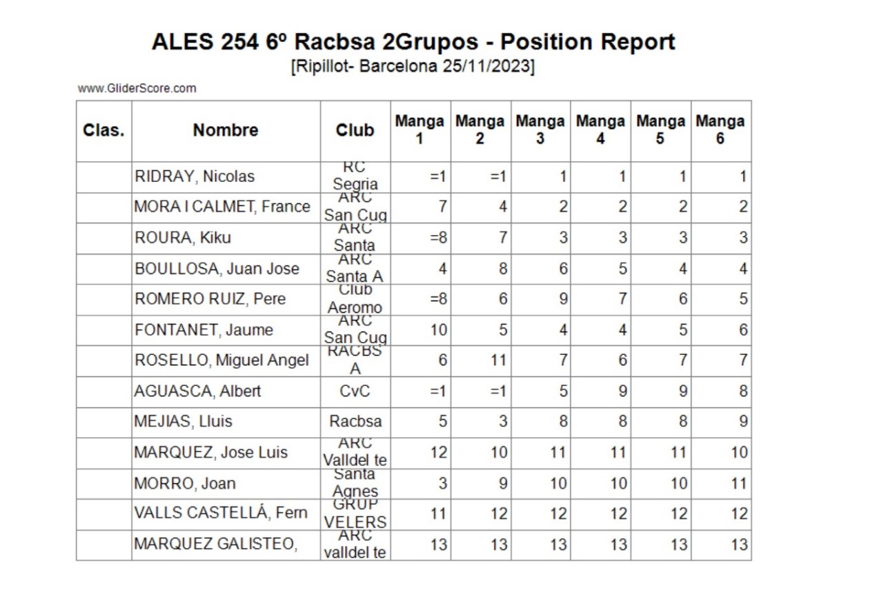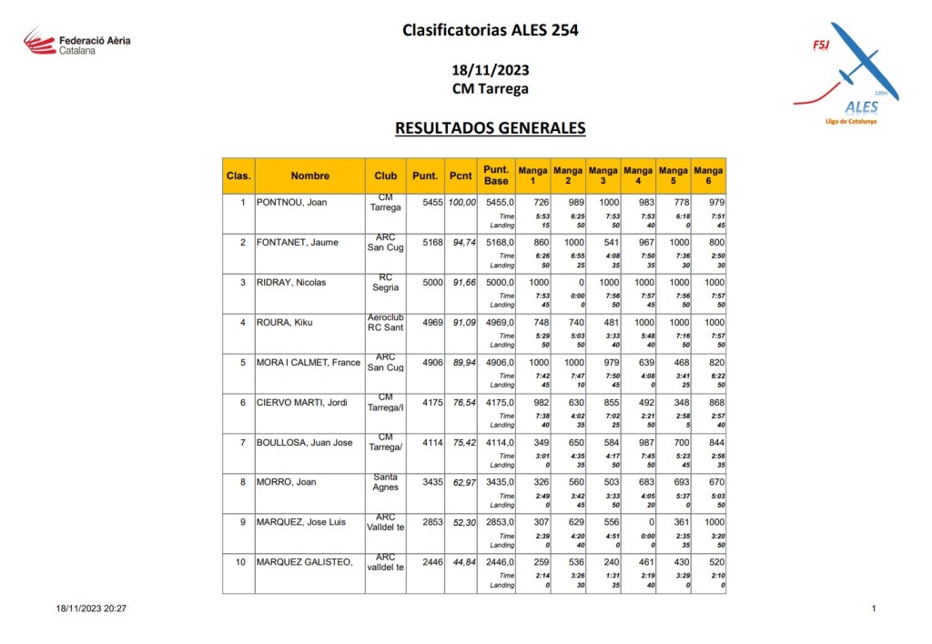 Una vez hecho el podio se procedió a recalcular la Liga de Cataluña F5J 2023 , resultando así la clasificación: