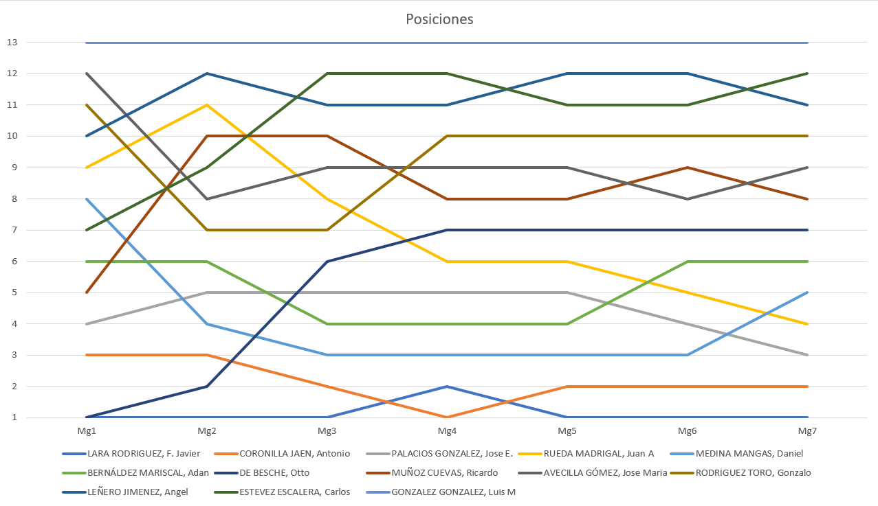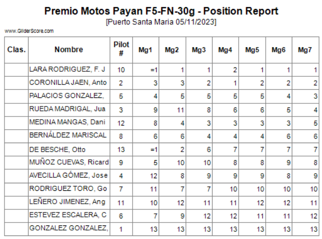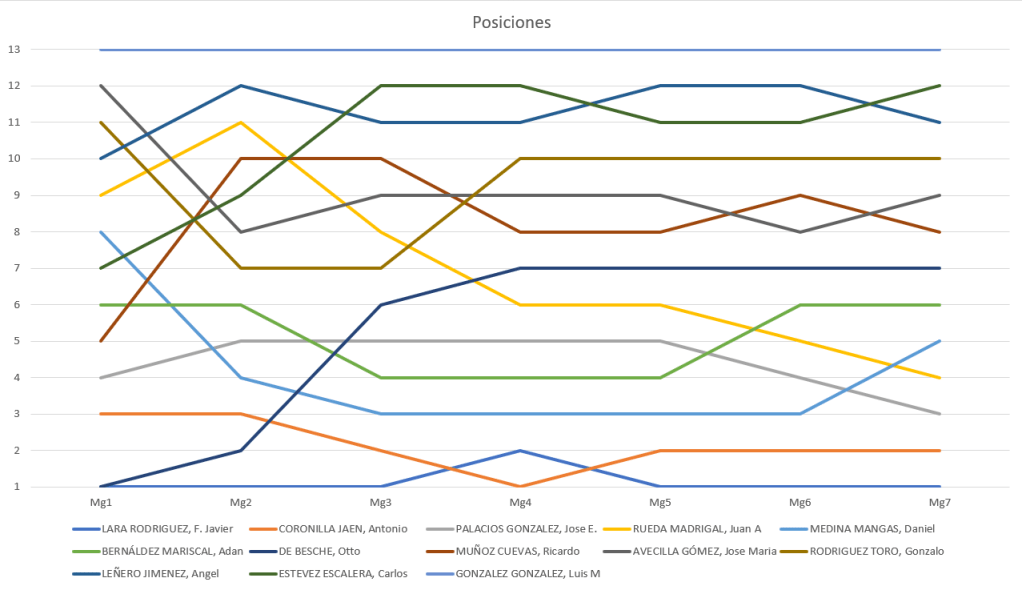 No hubo dudas en cuanto quien sería el primero por la cola jejeje, en cuanto a los puestos del podio la disputa entre Lara y Coronilla, aunque desconocida durante los vuelos, era patente y Medina también destacaba en los vuelos, una pena que el estreno del modelo no le permitiera un buen septimo vuelo por falta de gestión de la pila, al contrario que Palacios y Rueda. El resto de participantes fueron teniendo buenos y menos buenos vuelos que haría esos quiebros en la clasificación.