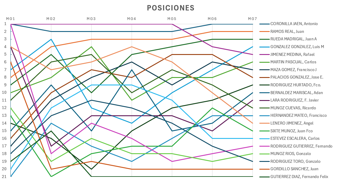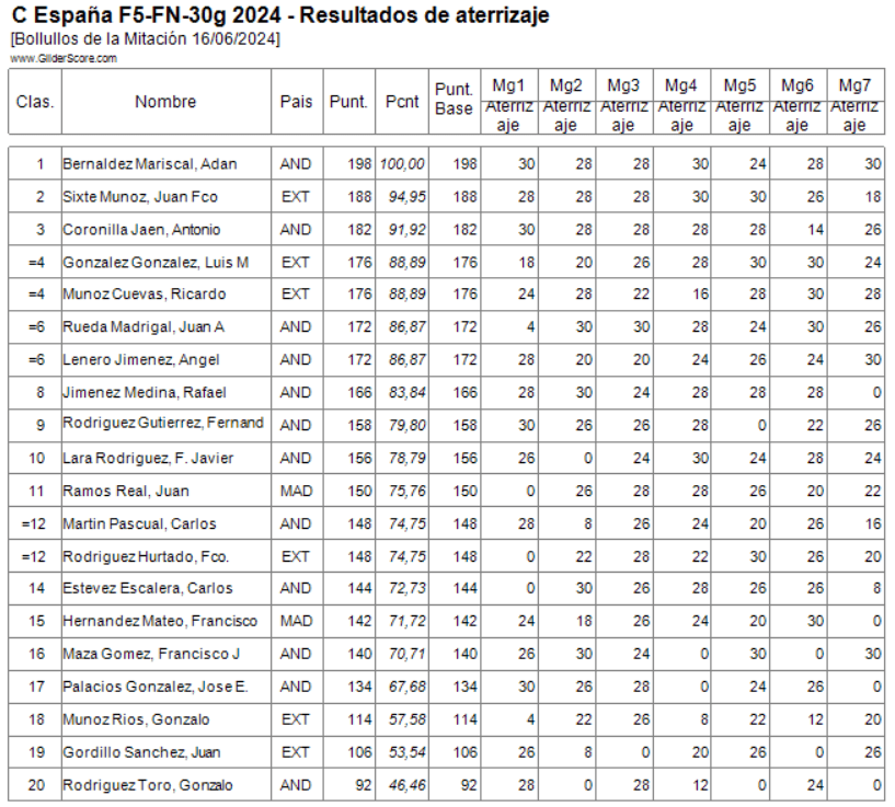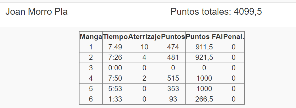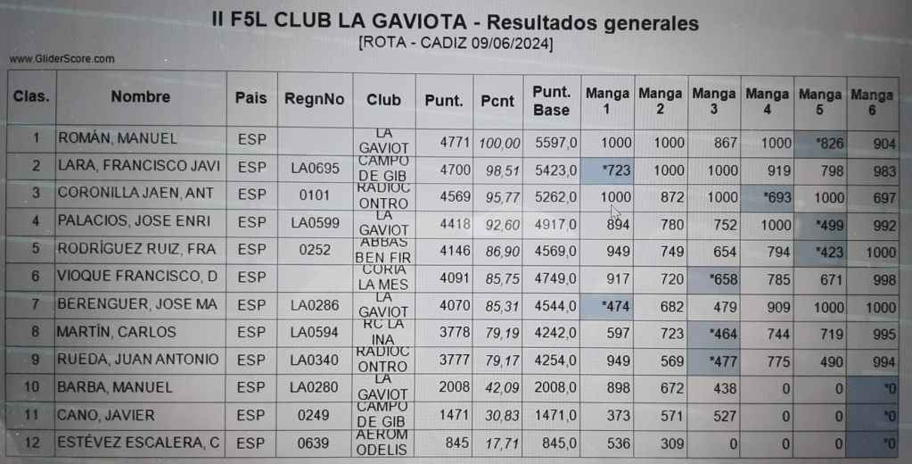 Bueno, no se pasó tanta «caló» como se temía, aunque sí mucha competencia y deportividad con unas condiciones cambiantes que no fueran fácil todos los vuelos, bueno, mas bien al revés, hizo difícil la mayoría de ellos y como nó la cabeza de la clasificación, se la disputaron dos magníficos pilotos y al final se impuso Coronilla seguido de dos Juanes, Ramos y Rueda y hasta esa clasificación muy movida.