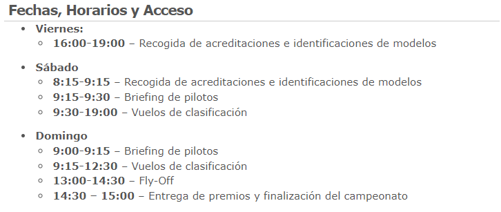 - Acceso al campo de vuelo: El campo de vuelo estará abierto desde el viernes. Se aconseja a los participantes que lleguen con antelación para conocer el terreno y realizar vuelos de prueba.