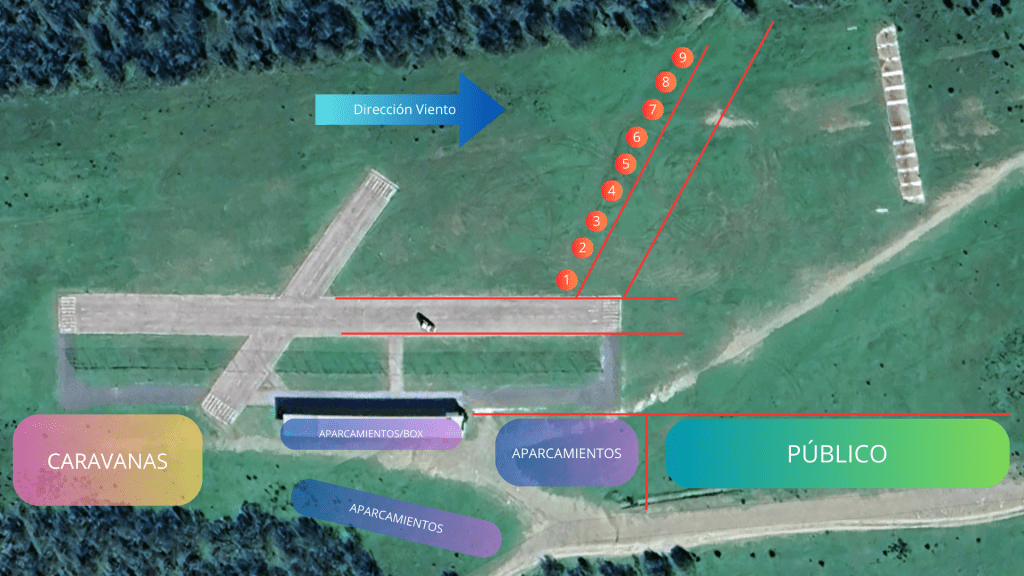 A continuación se indica de manera gráfica la disposición de la pista así como los puntos de despegue, zona de caravanas, aparcamientos, etc.