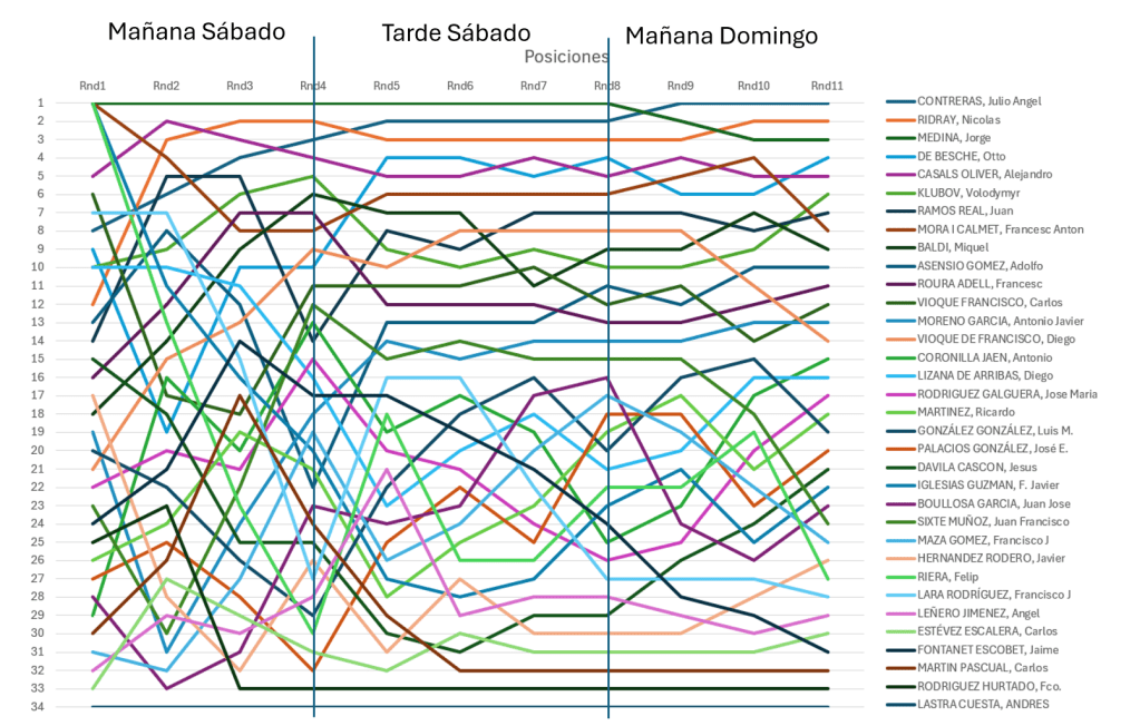 En el grafico de las ‘posiciones’ durante los vuelos calificatorios se ve la diferencia de dificultad de los vuelos en los tres tramos, mañana y tarde del sábado y las primeras horas del domingo y luego los del Fly-off, impresionantes por las condiciones meteorológicas