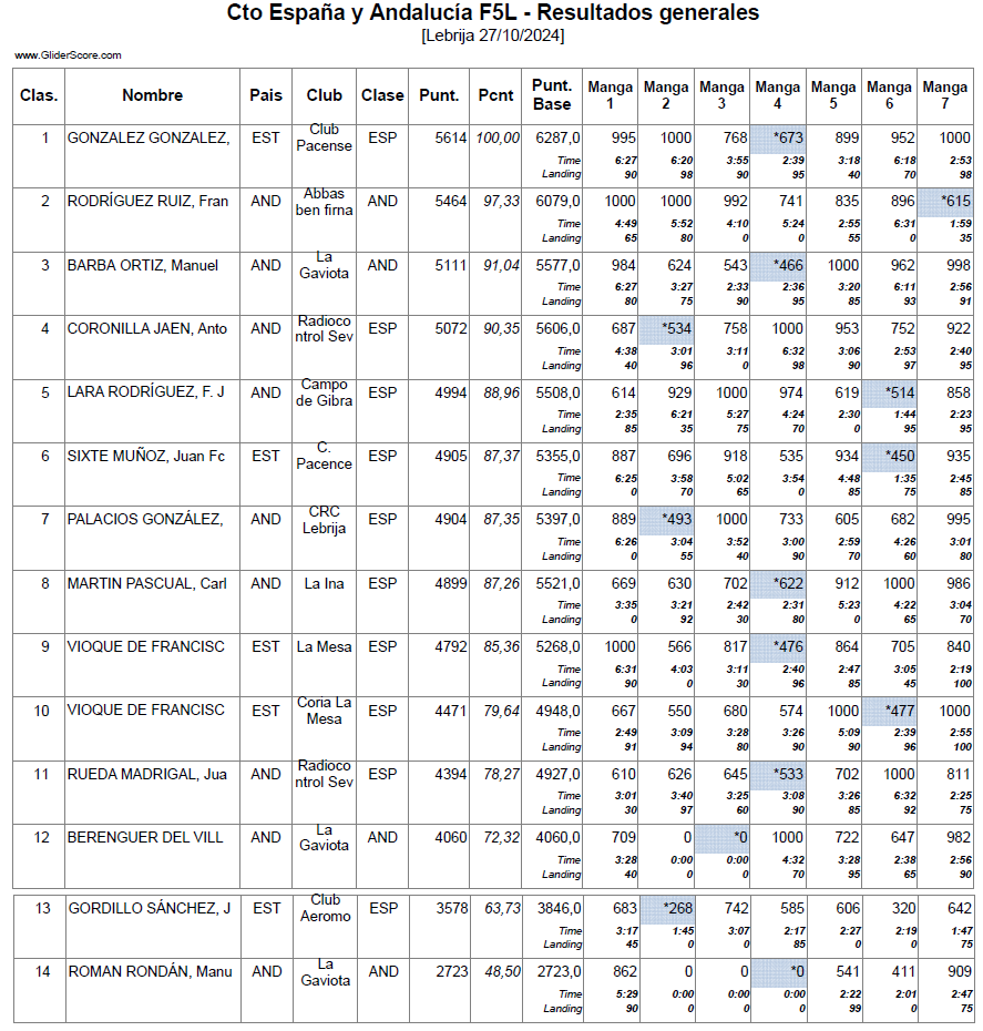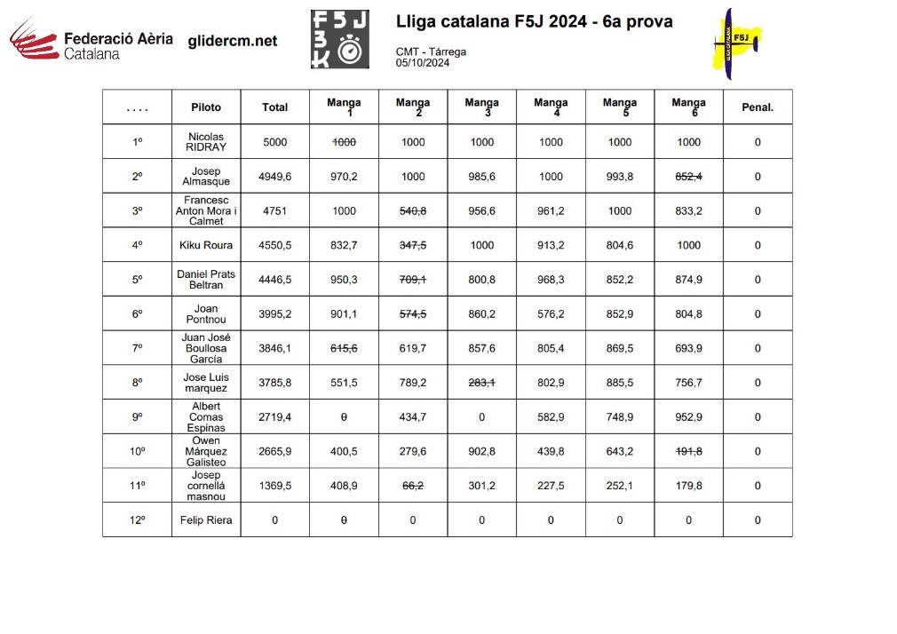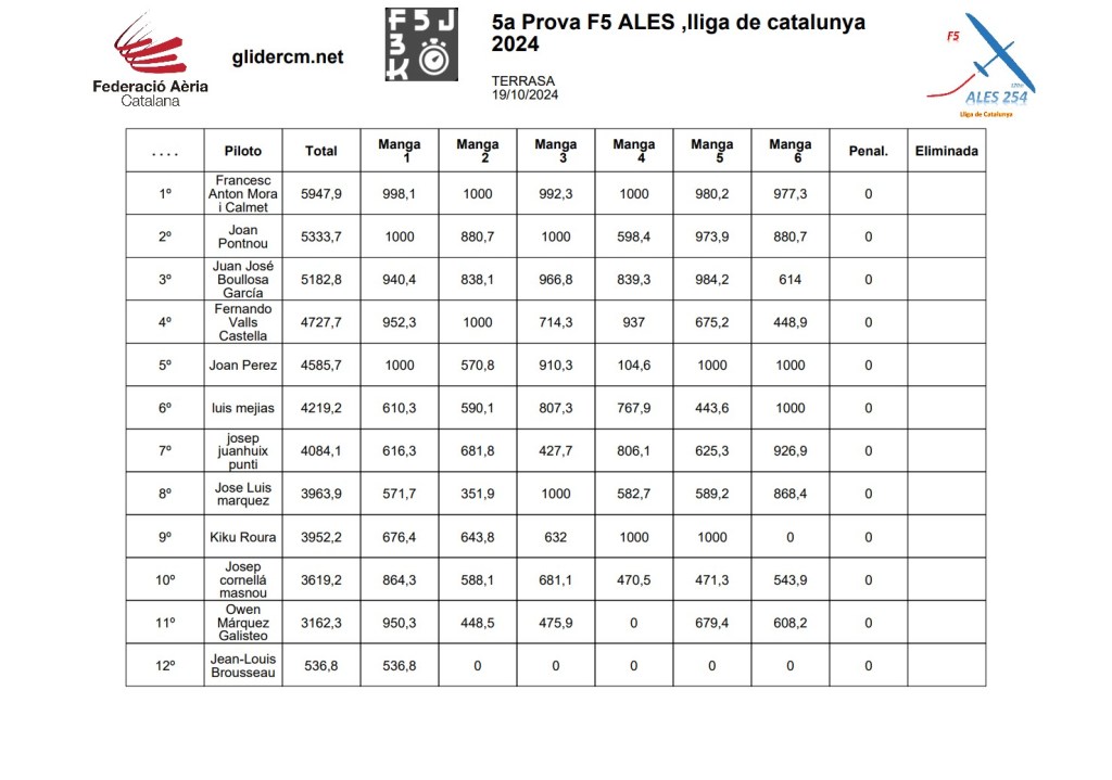 Francesc Mora y Juan Pérez fueron muy regulares no regalando ni un punto, con grandes vuelos y aterrizajes, a Juan Pérez le recordó los años de 50g, con gente que empezaba, este grupo de participantes es competitivo y muy solidario con los que participan por primera vez o se inician, creo irán con el tiempo introduciéndose en F5J FAI ya toreados, pero siguiendo en ALES por sencillez y facilidad.