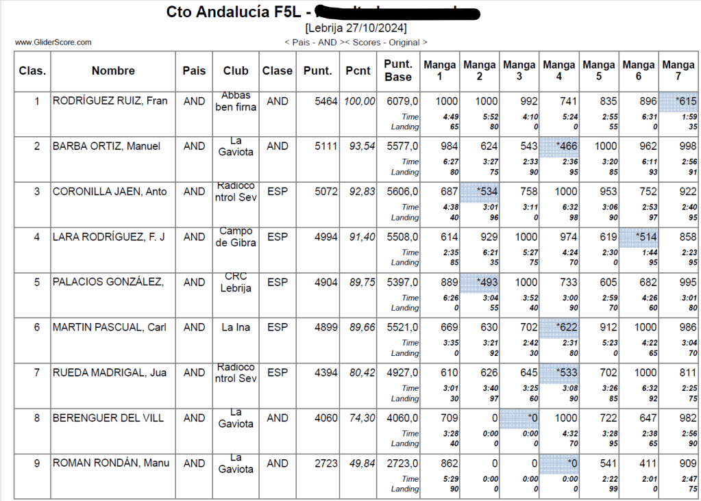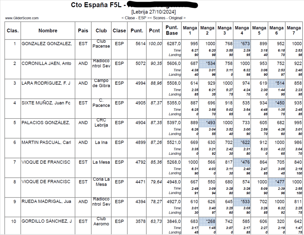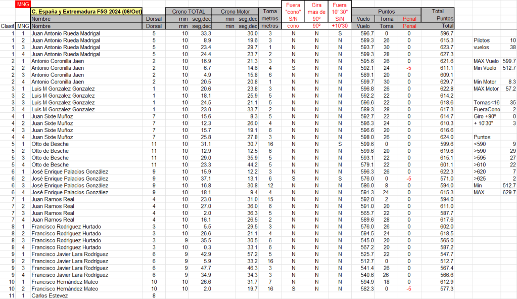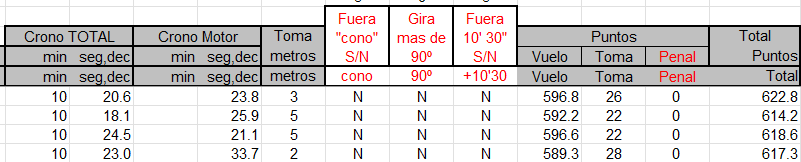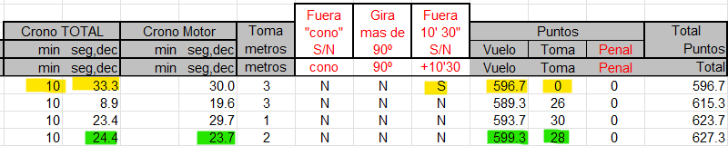 En el primer vuelo, marcado en amarillo, podemos ver que el tiempo de vuelo excede los 10’30» por lo que la toma puntua cero (pese a que la toma sólo fué a tres metros del centro); como el tiempo de motor fué 30″ y el de vuelo 10’33» resulta que se ha excedido el tiempo sin motor en en 3,3″ y es por ello que la puntuación del vuelo es 596.7 (600-3.3). En el cuarto vuelo podemos ver que el exceso de los diez minutos de vuelo y el tiempo de motor es mucho mas cercano, por ello la puntuación del vuelo solo está penalizada en 0.7 puntos (24.4 – 23.7) y como la toma es a dos metros, la puntuación de aterizaje añade 28 puntos haciendo un total de 627.3 puntos, casi el máximo (630). En esta modalidad, al no volarse por grupos no procede esa conversion a 1000 del mejor vuelo y al resto de proporcionalmente; se suele despegar con una cadencia de cuatro minutos, a los efectos de igualmente separar las tomas ese tiempo aproximadamente.